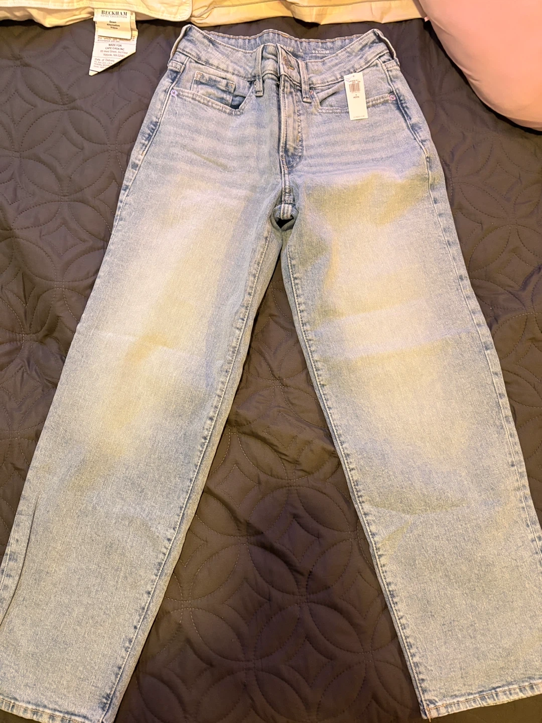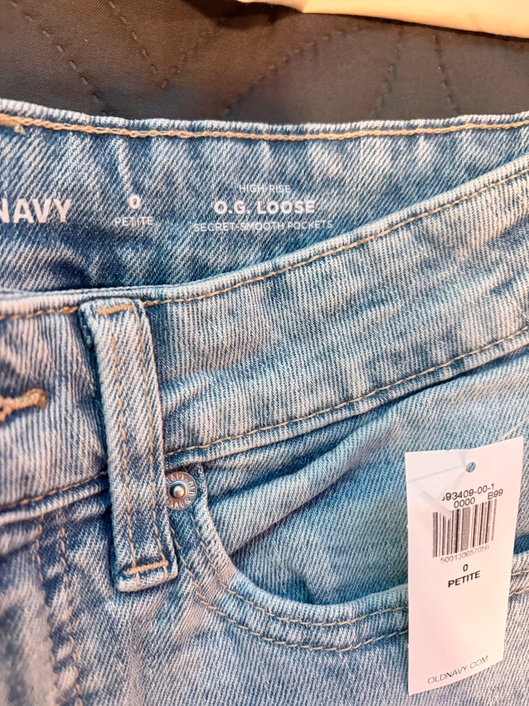 These are Old Navy OG Loose High-Rise jeans in a light wash. They're a petite size 0 with secret-smooth pockets. Made from denim.