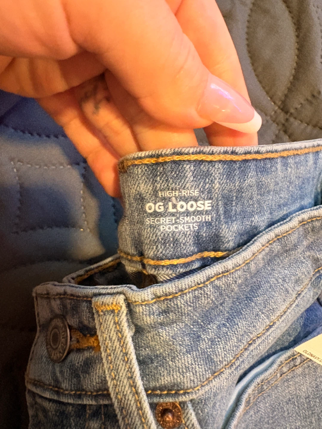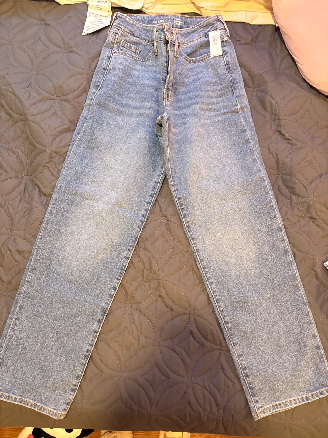 These are Old Navy OG Loose High-Rise jeans in a light wash. They're a petite size 0 with secret-smooth pockets. Made from denim.