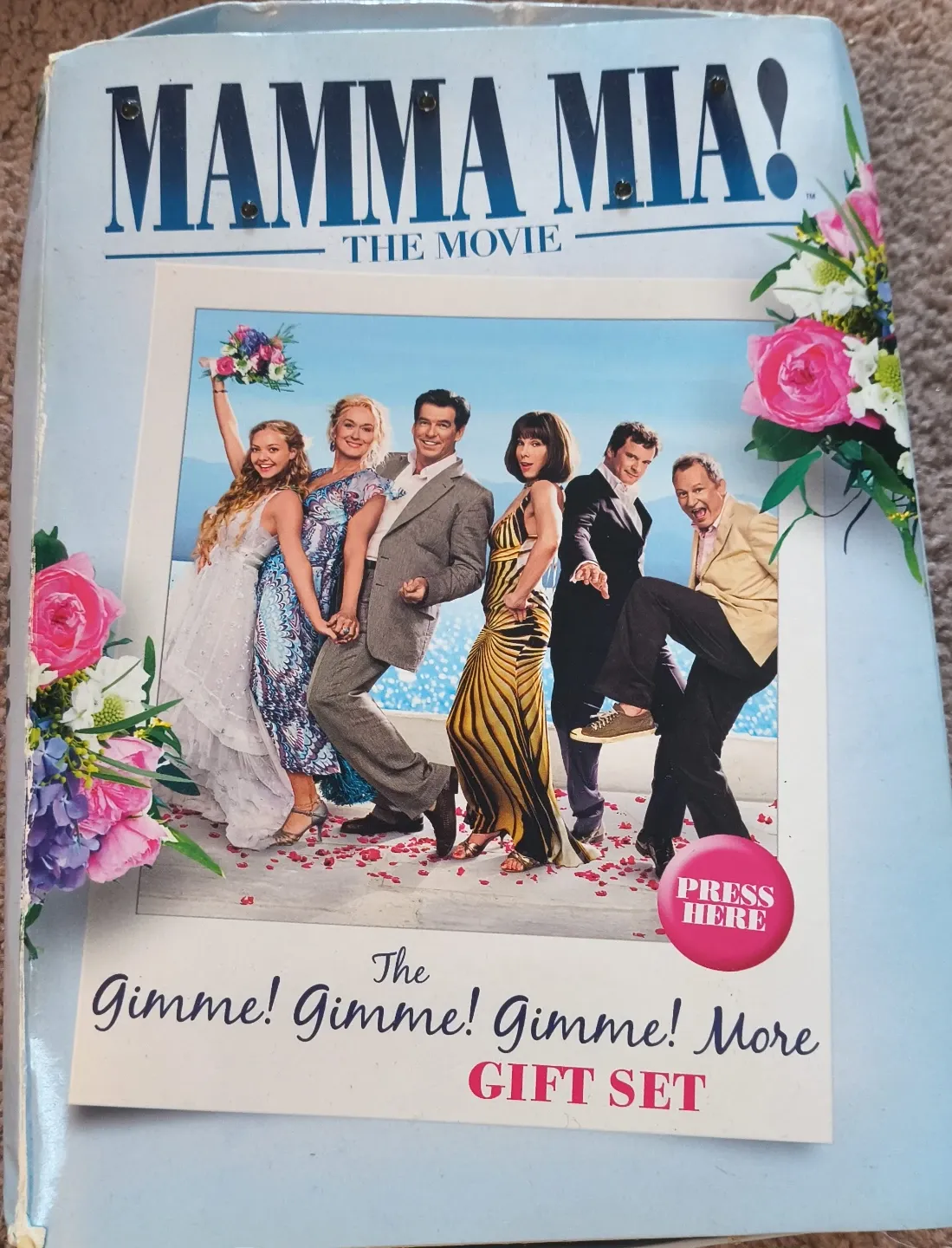 This is the Mamma Mia! The Movie Gimme! Gimme! Gimme! More Gift Set. It includes items related to the film. Perfect for fans of the movie!