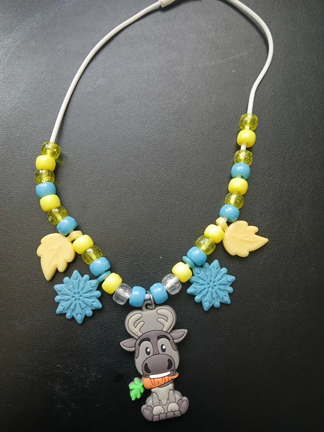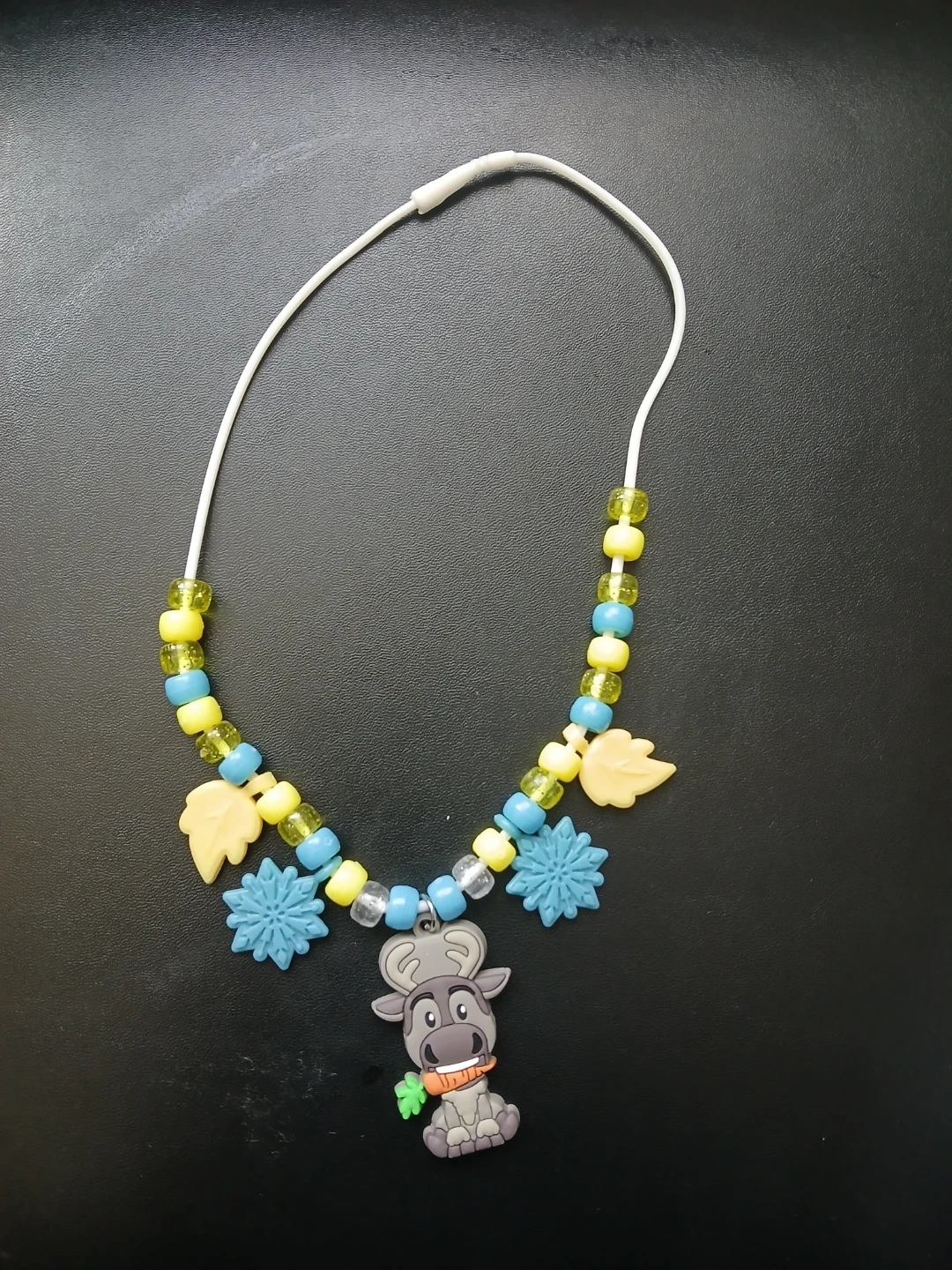 This fun necklace features blue and yellow beads with snowflake and leaf charms. It includes a pendant of Sven from Frozen, happily munching on a carrot. Perfect for any little fan!