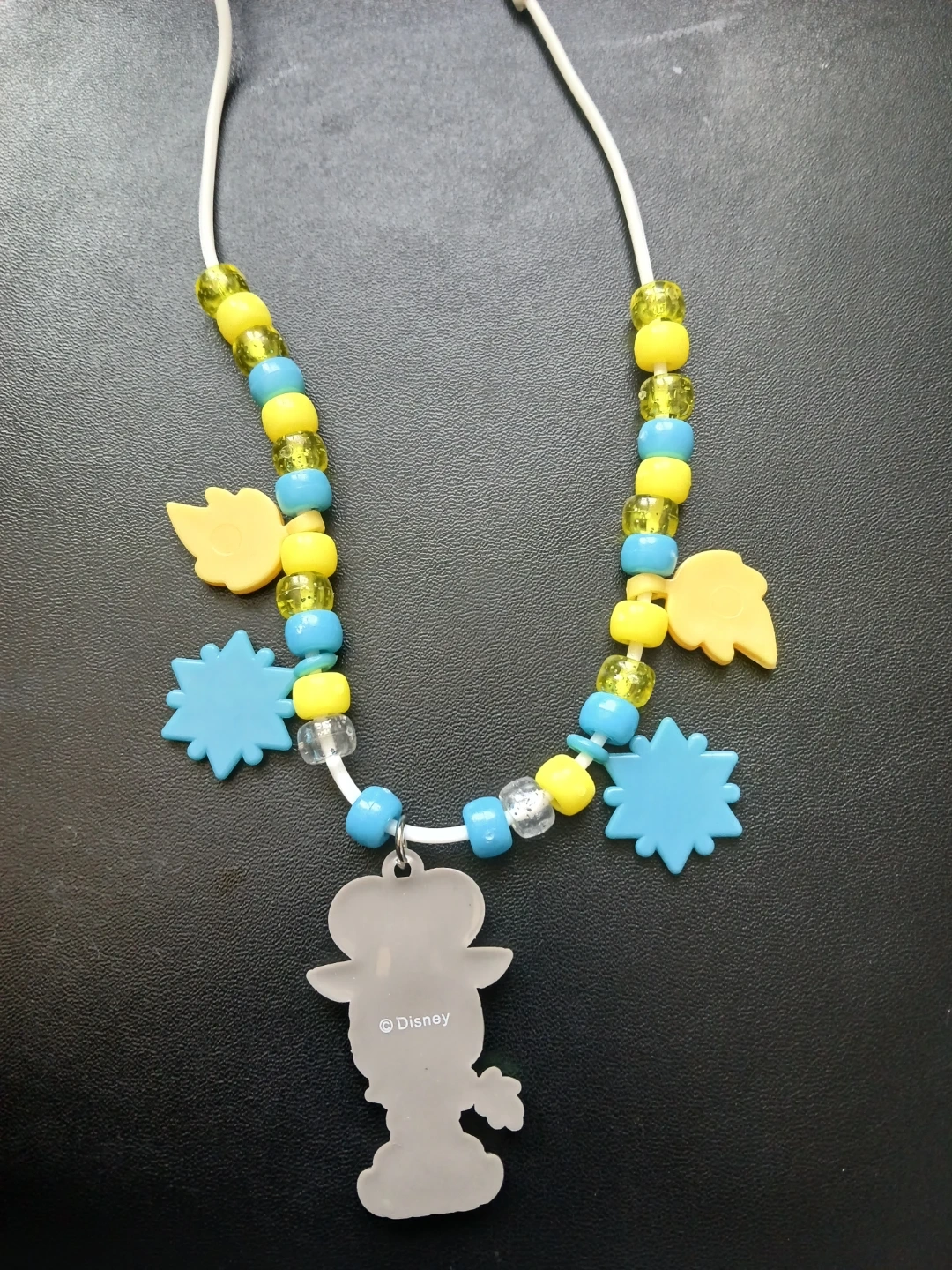 This fun necklace features blue and yellow beads with snowflake and leaf charms. It includes a pendant of Sven from Frozen, happily munching on a carrot. Perfect for any little fan!