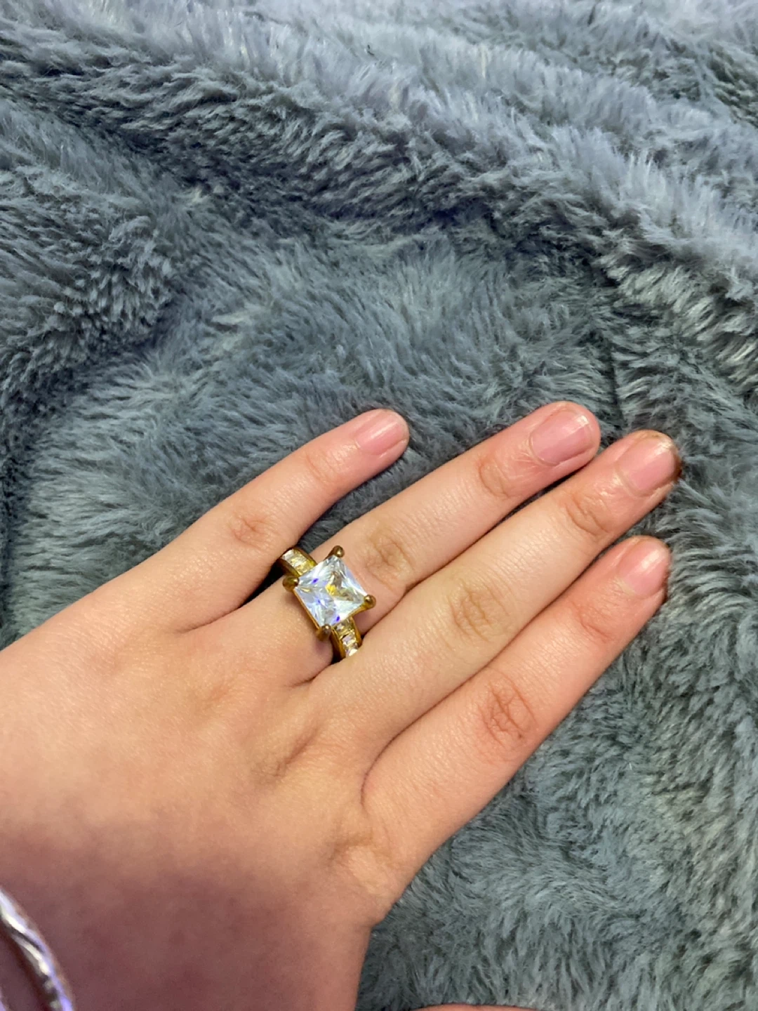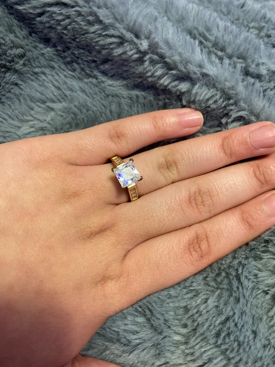 Elegant gold-tone ring featuring a prominent square-cut clear gemstone. Band is detailed with smaller accent stones. It's a statement piece for any occasion!