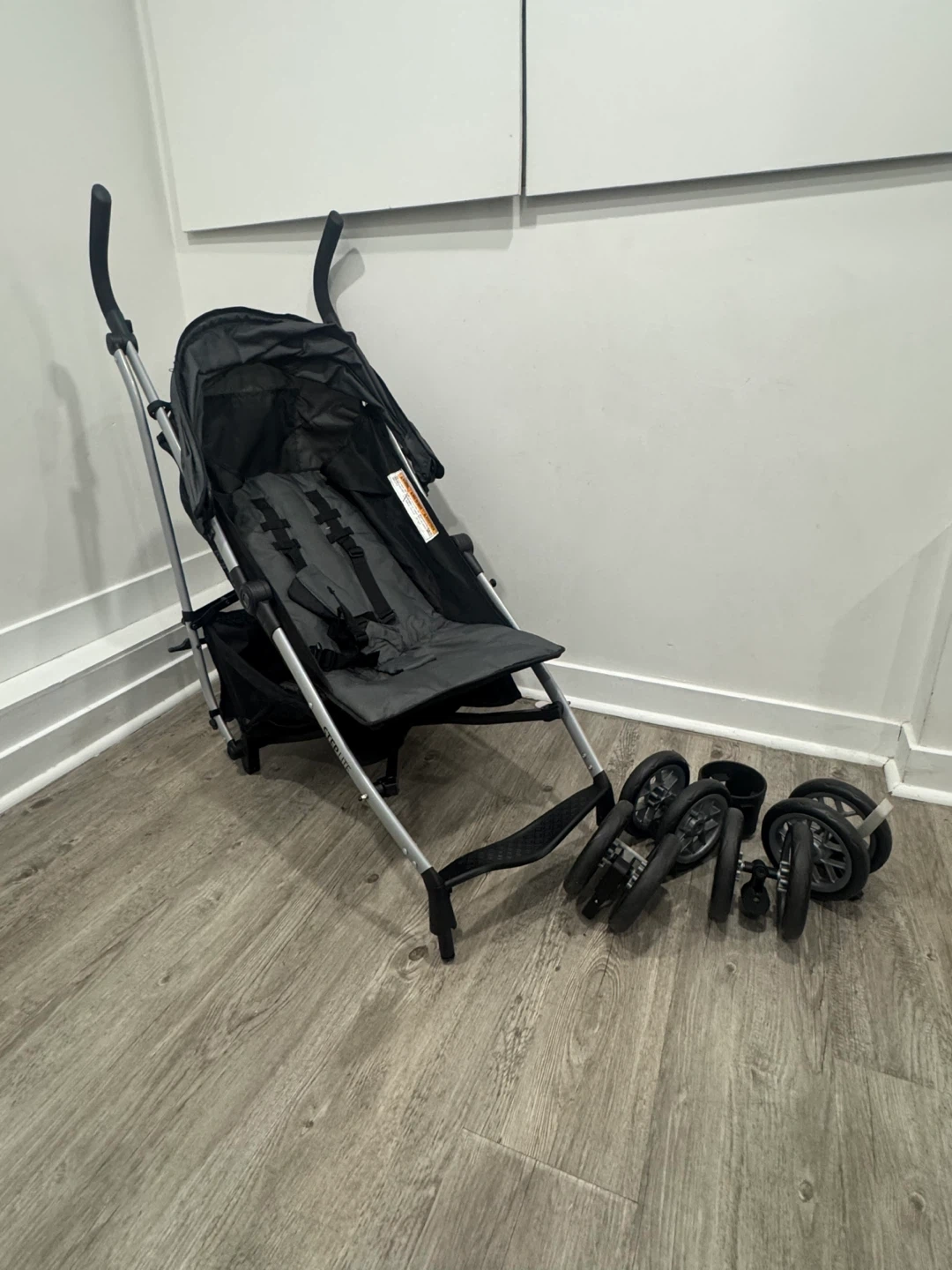 This Safety 1st stroller is designed for easy portability. It's lightweight and comes with removable wheels. It features a five-point harness for your child's safety. This stroller is suitable for travel.