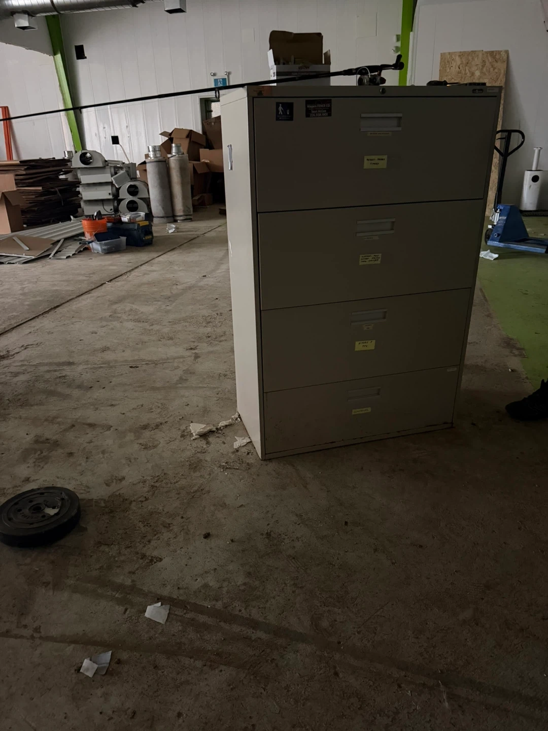 Four-drawer metal filing cabinet. It's a standard size for office documents. This cabinet is great for organizing papers and files in a home office or commercial space.