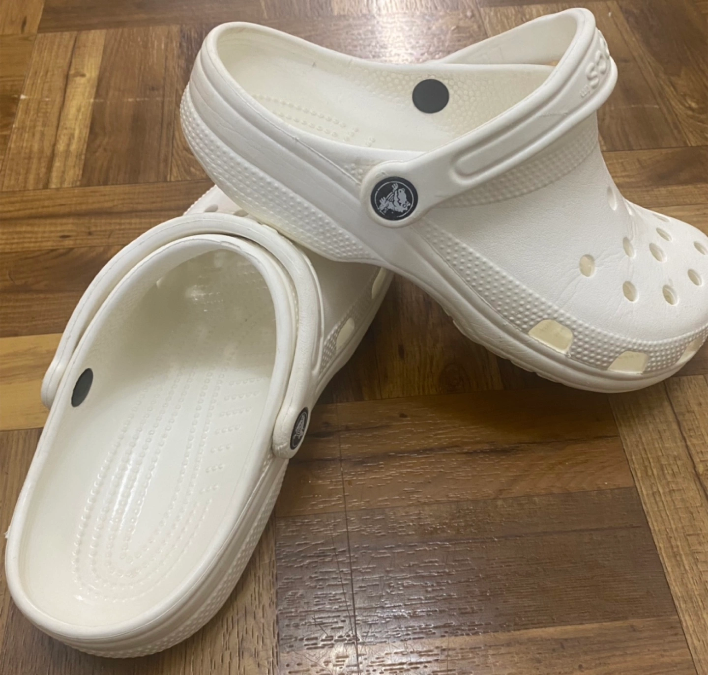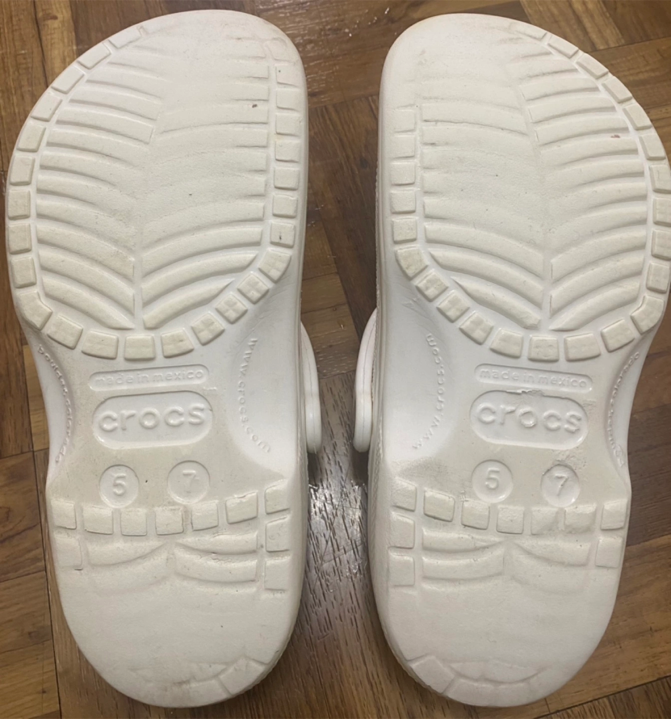 Selling a pair of white Crocs Classic clogs. They are marked as size 7, which corresponds to a women's size 5. Great for casual wear and comfy for everyday use