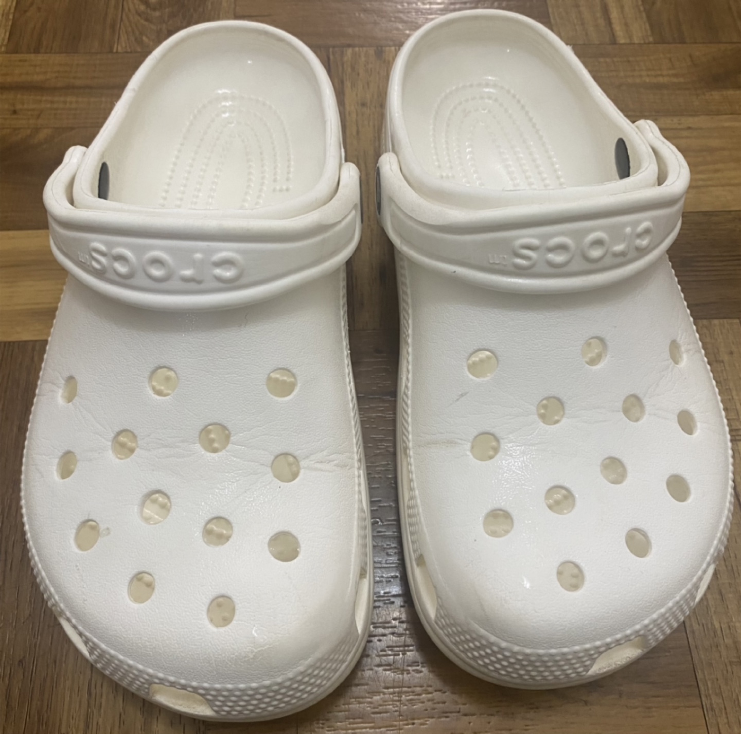 Selling a pair of white Crocs Classic clogs. They are marked as size 7, which corresponds to a women's size 5. Great for casual wear and comfy for everyday use