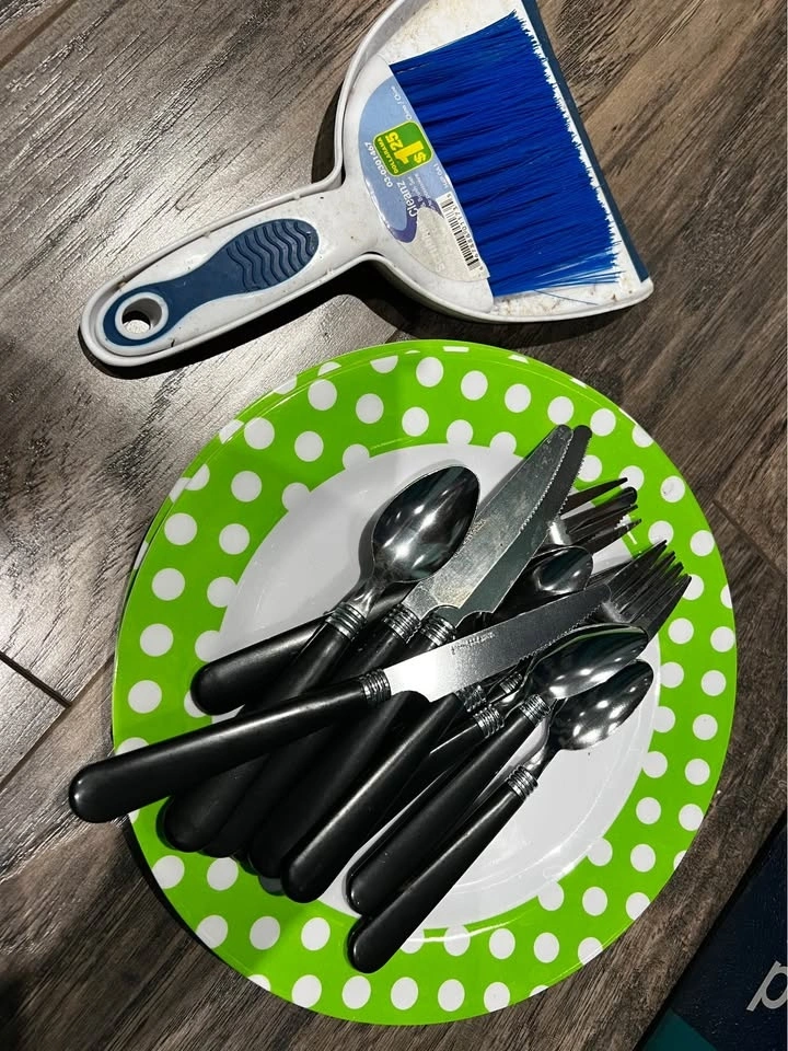 Used one time only. Set includes 4 plastic plates and cutlery for 4 (forks, knives, spoons). Also includes a mini broom and dustpan, wash basin, and mini lamp. Pick up in Keswick.