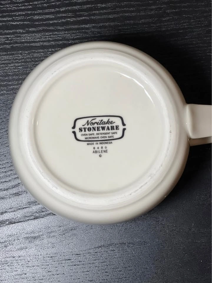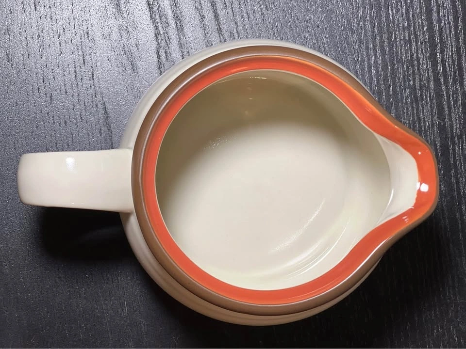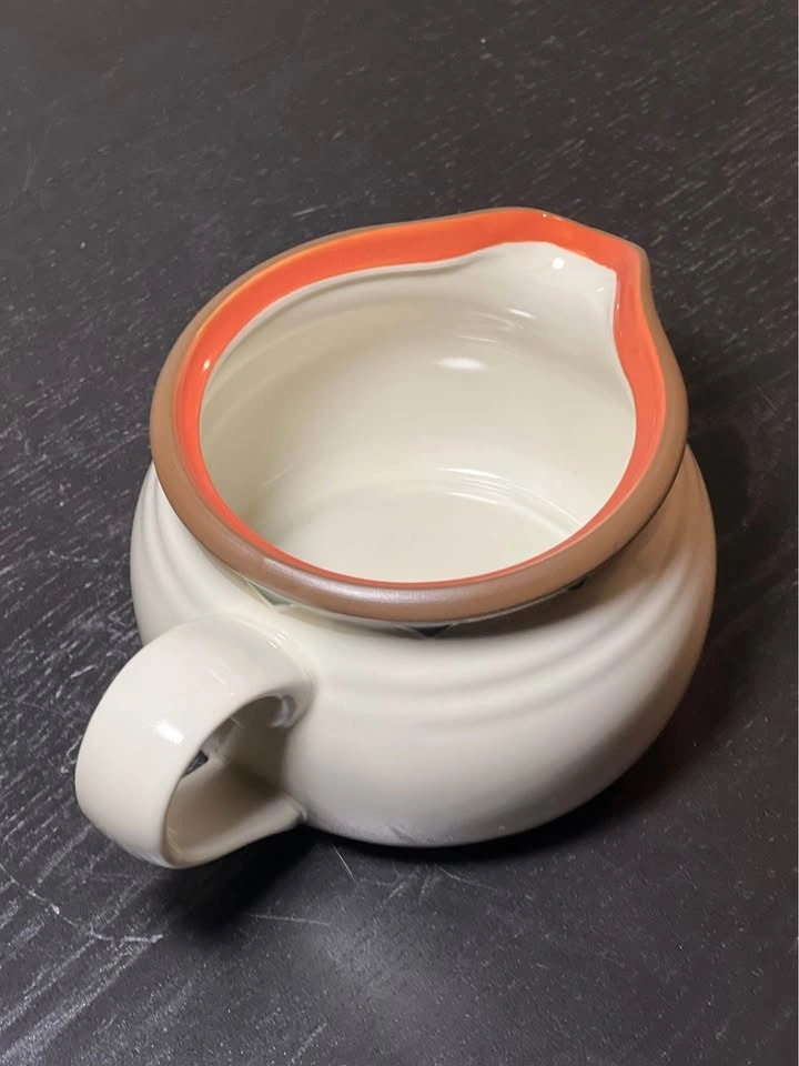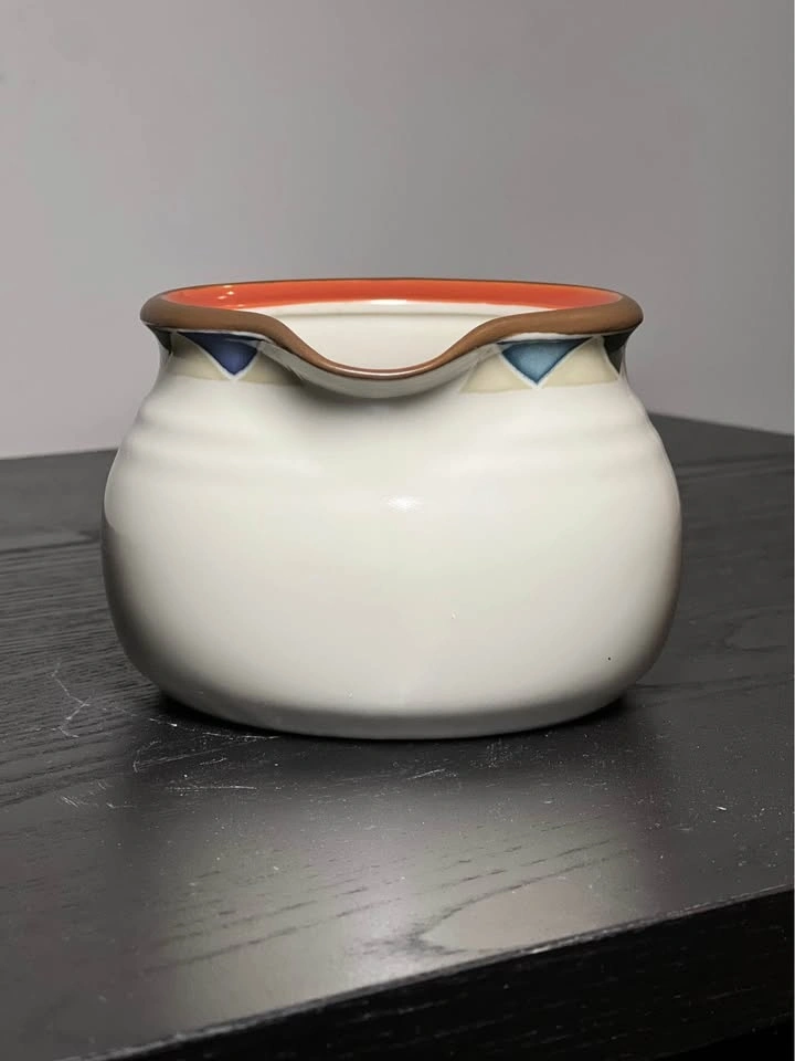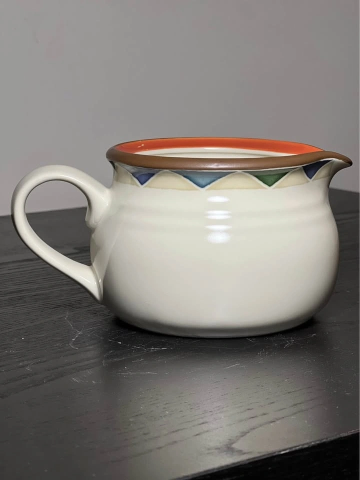 This is a Noritake stoneware creamer or pitcher from the Abilene (pattern 8480) collection. It features a distinct southwestern triangle pattern in blue, green, and beige, with a burnt umber rim. This pattern is discontinued.