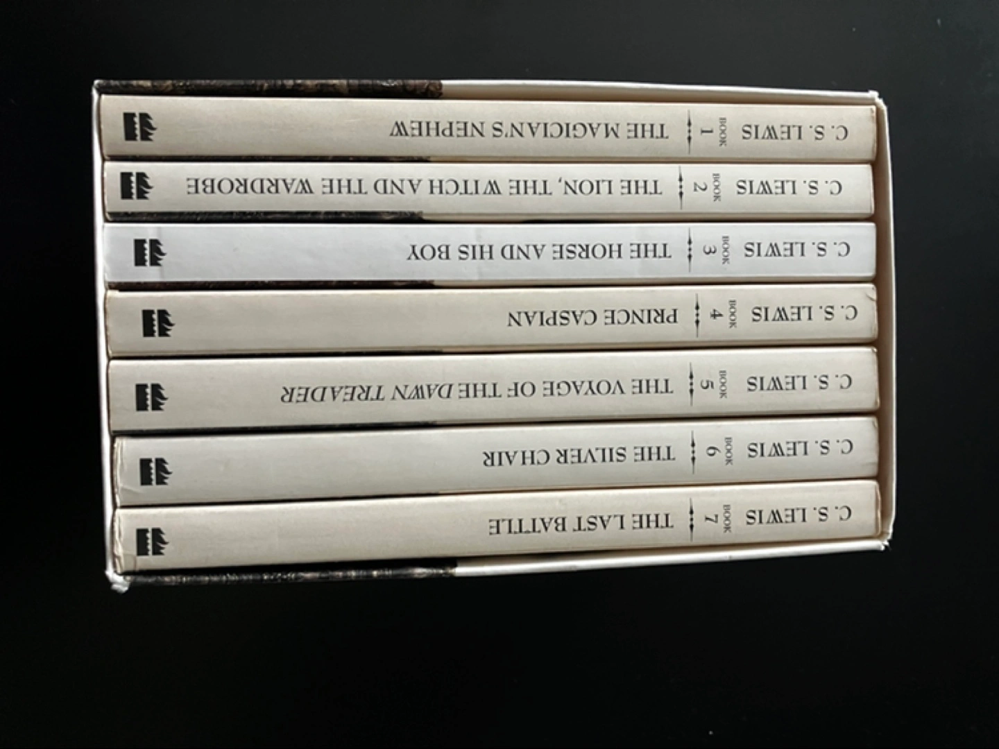 Complete seven-book boxed set. Includes The Lion, the Witch and the Wardrobe, Prince Caspian, The Voyage of the Dawn Treader, The Silver Chair, The Horse and His Boy, The Magician's Nephew, and The Last Battle. Vintage collectible.