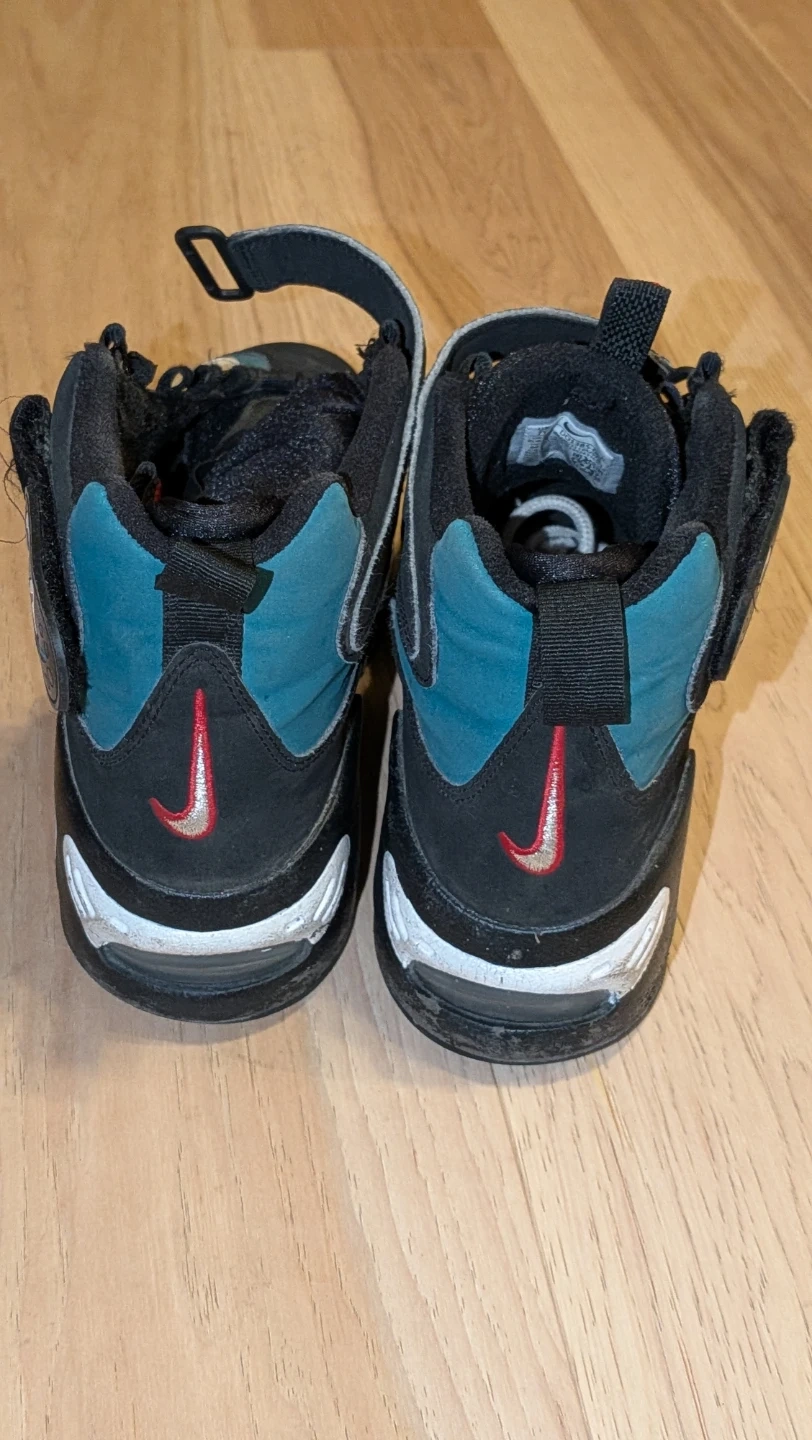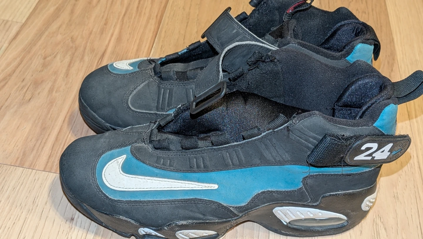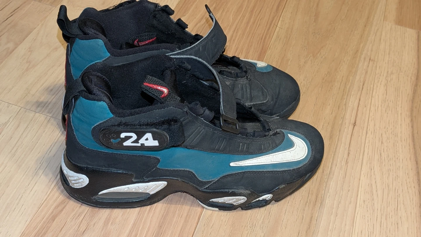 Classic Nike Air Griffey Max 1 sneakers in black and teal. Features a hook-and-loop strap closure. Includes "24" detailing. Good for collectors or casual wear.