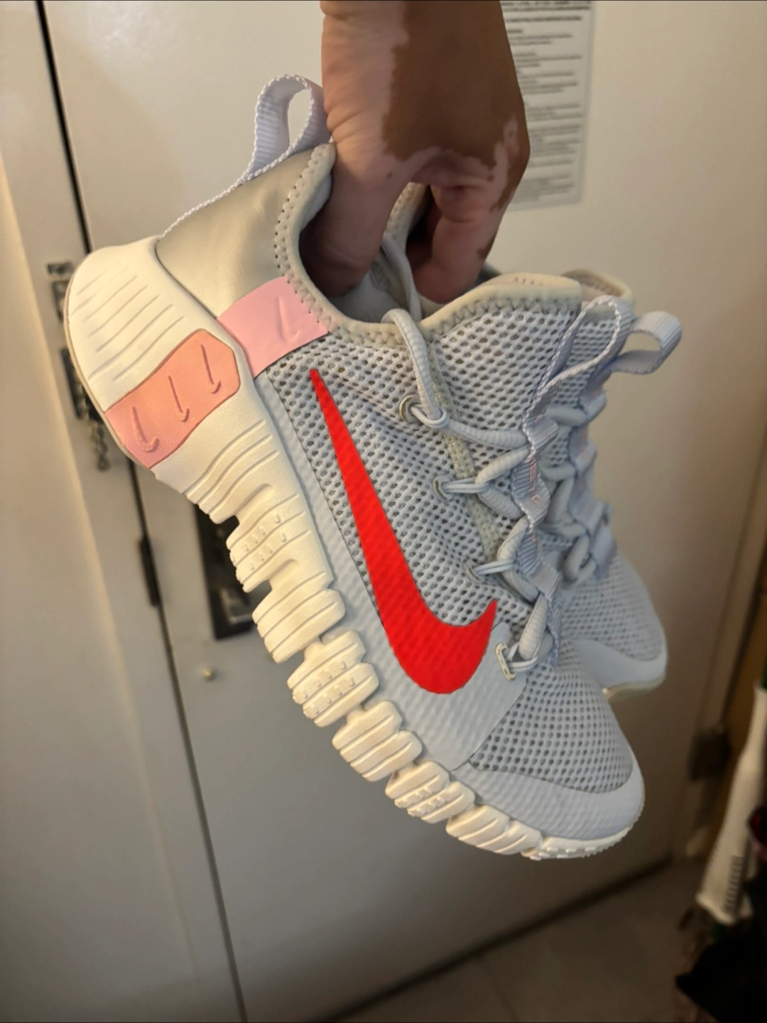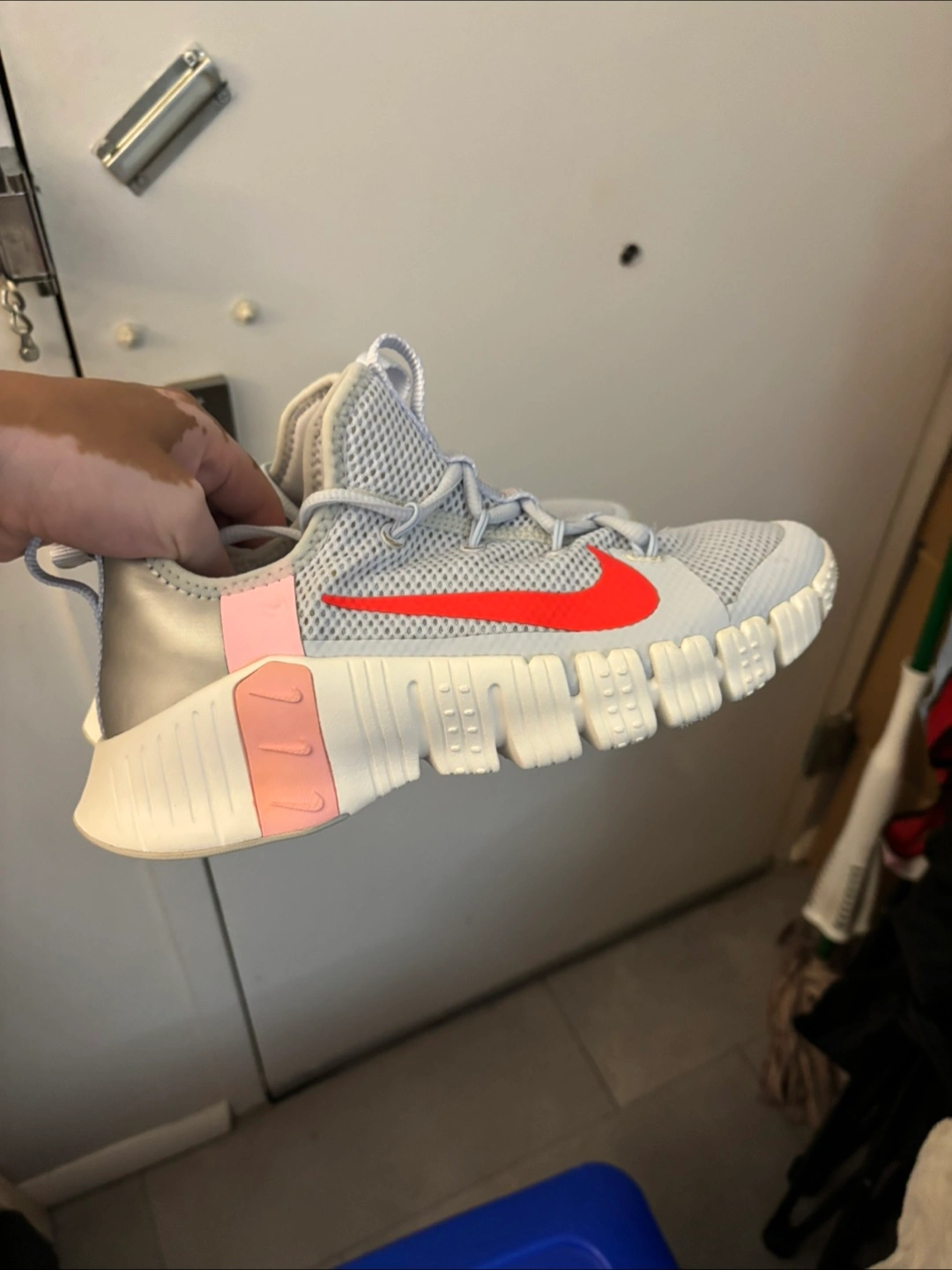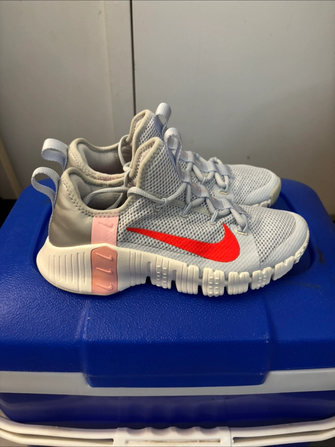 Selling a pair of Nike Free Metcon 4 women's training shoes. They're in great condition and ready for a new owner! The shoes feature a gray and white color scheme with a vibrant red Nike swoosh. Perfect for workouts or everyday wear