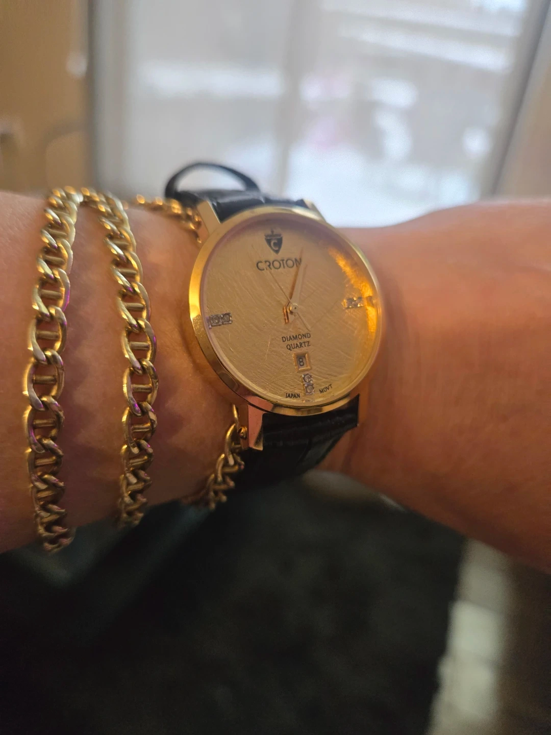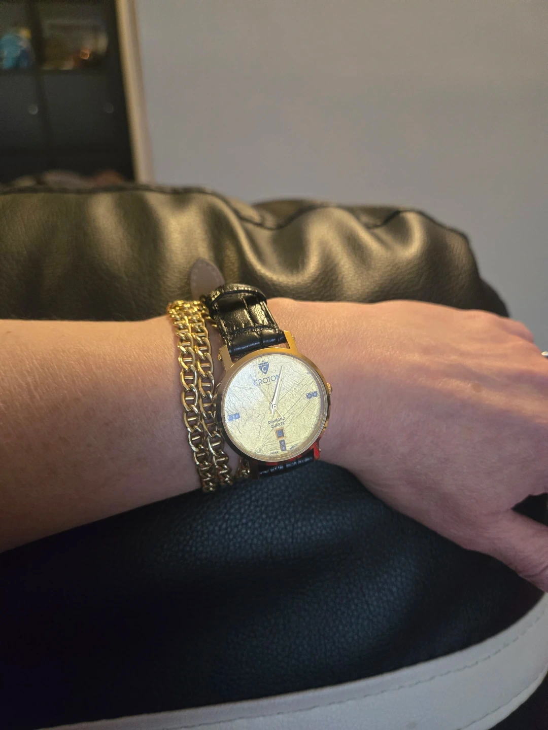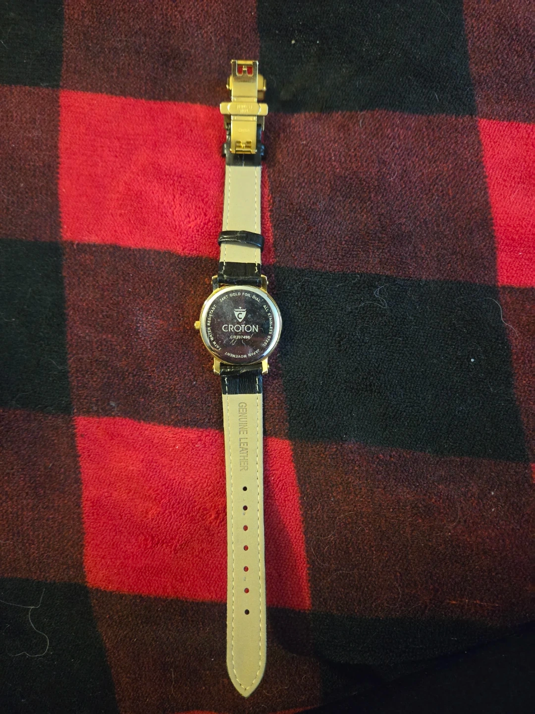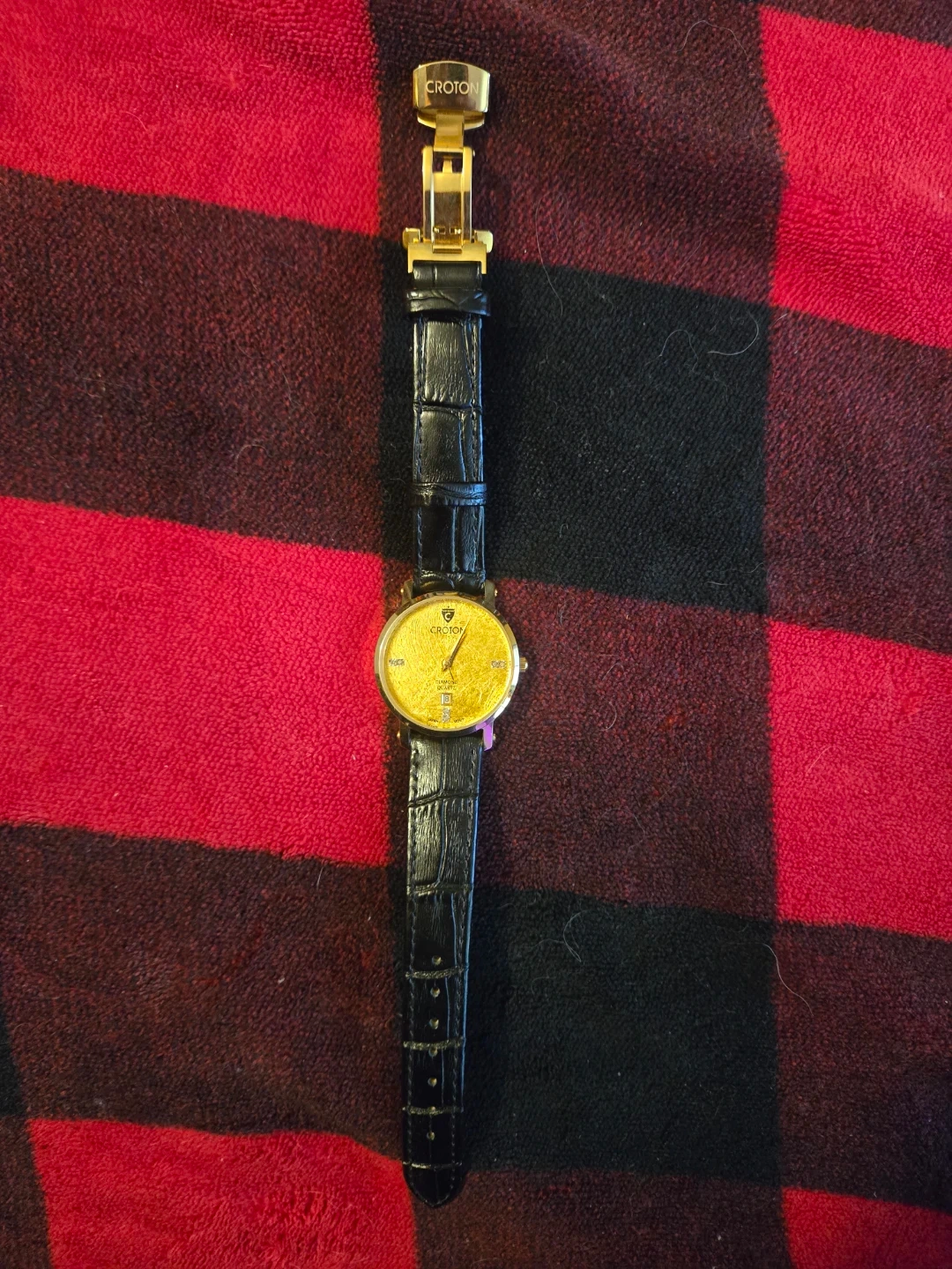 Croton quartz watch with a 24kt gold foil dial and diamond accents. It features a genuine leather band and stainless steel case. Water resistant up to 3 ATM.