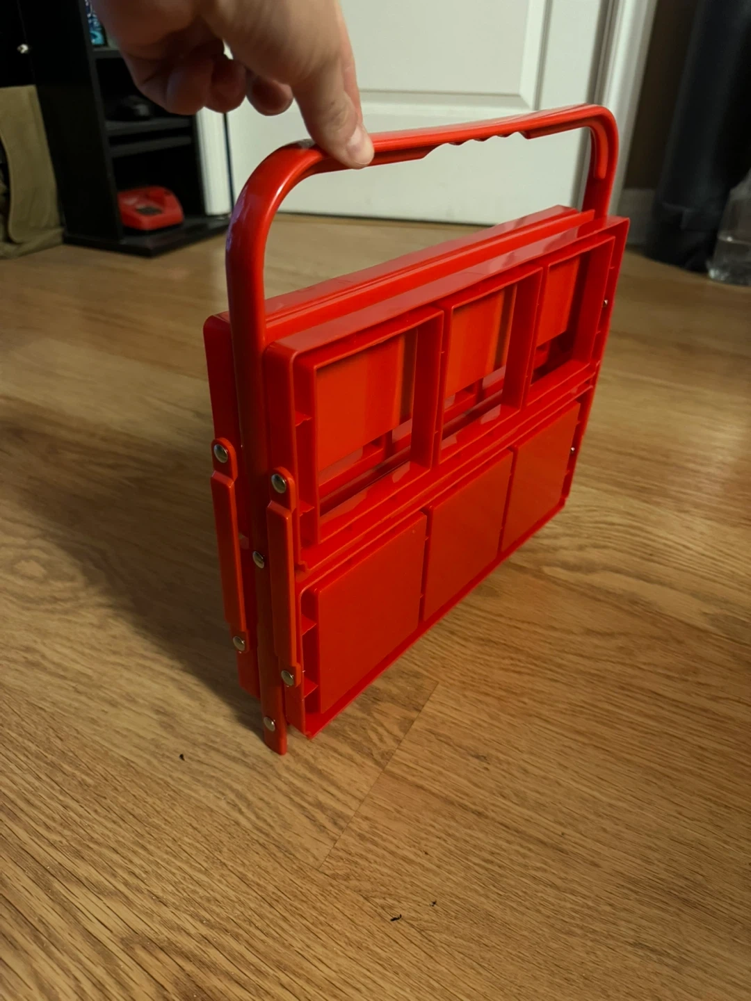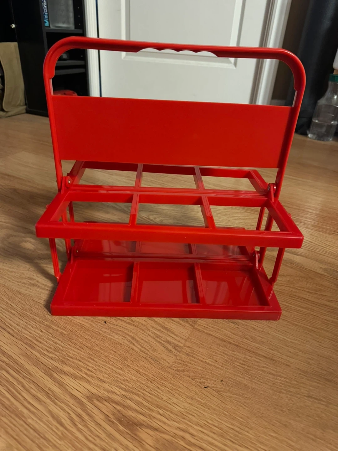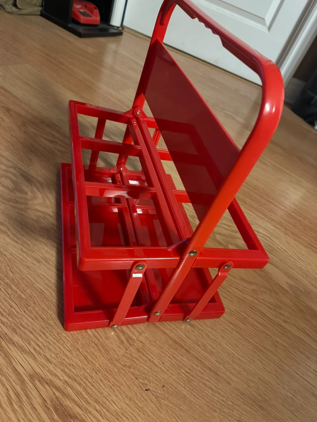 Red metal caddy designed to hold six bottles. It's a folding carrier with a convenient handle for transport. This caddy is great for organizing drinks or for craft projects!