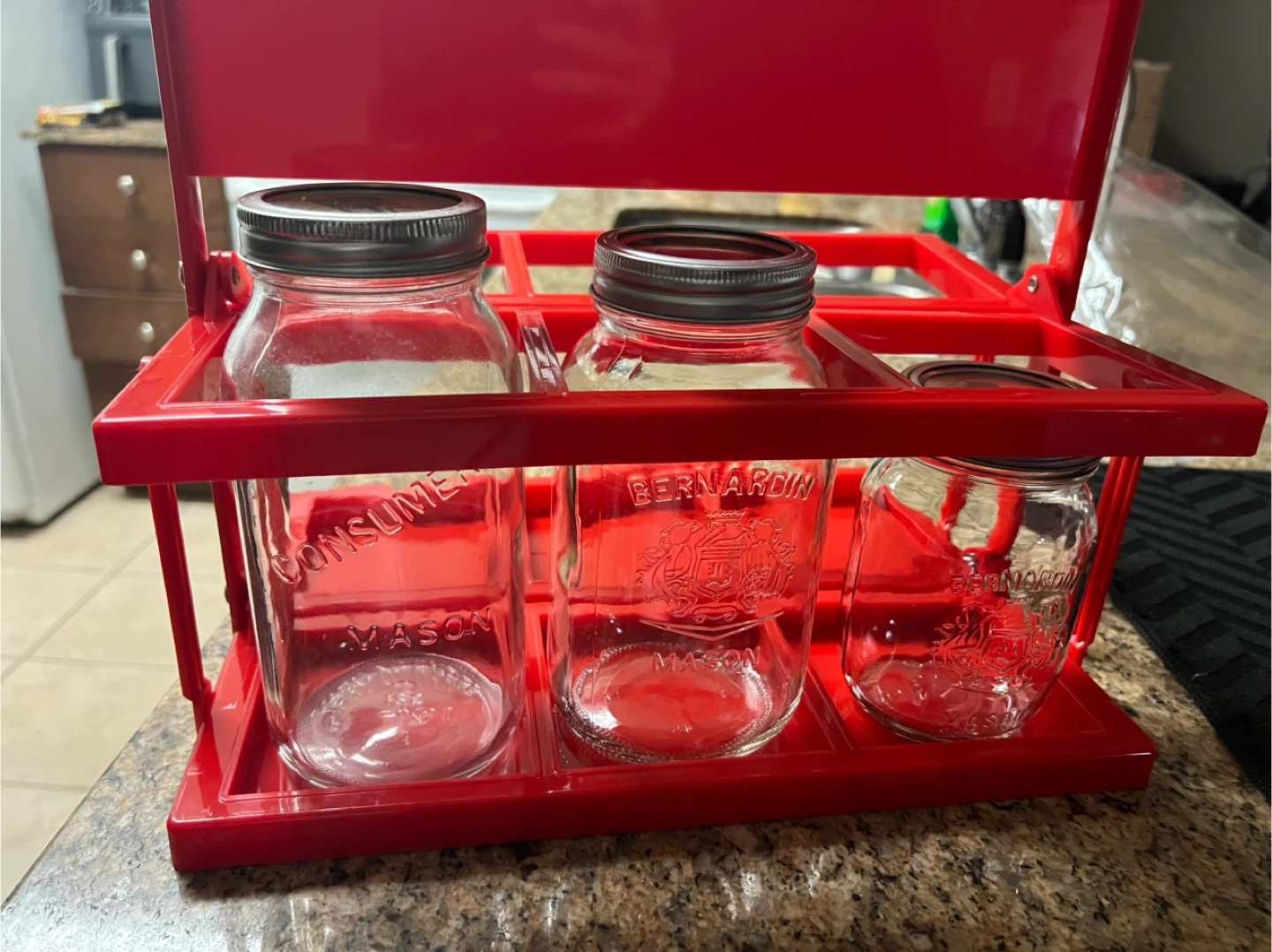 Red metal caddy designed to hold six bottles. It's a folding carrier with a convenient handle for transport. This caddy is great for organizing drinks or for craft projects!