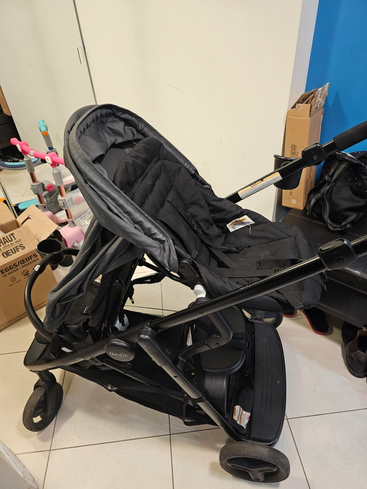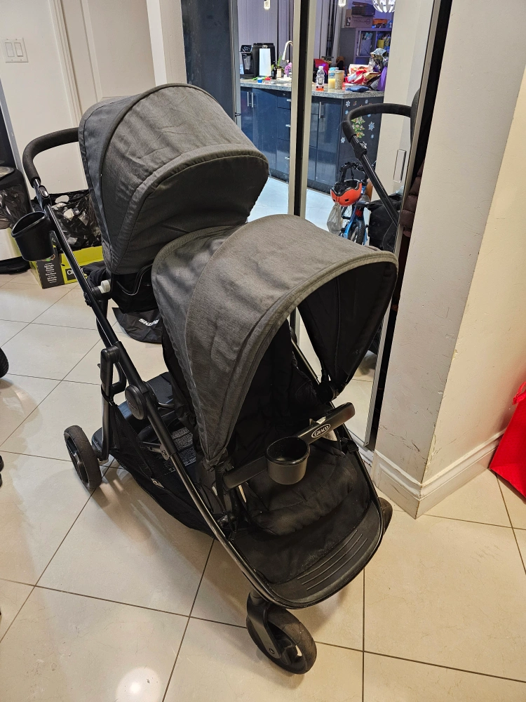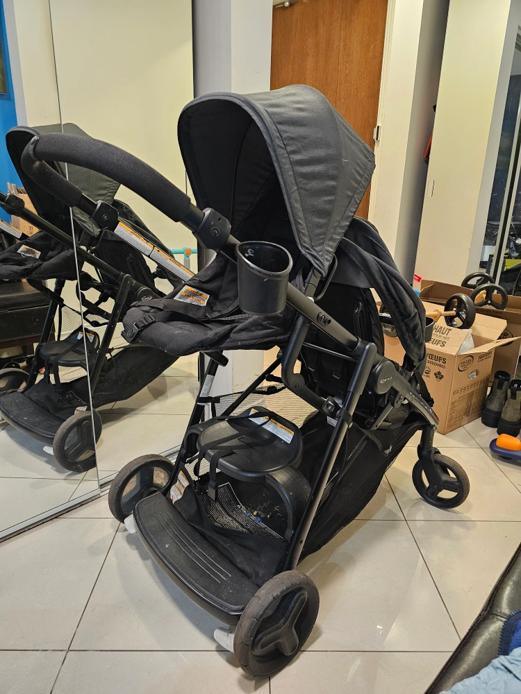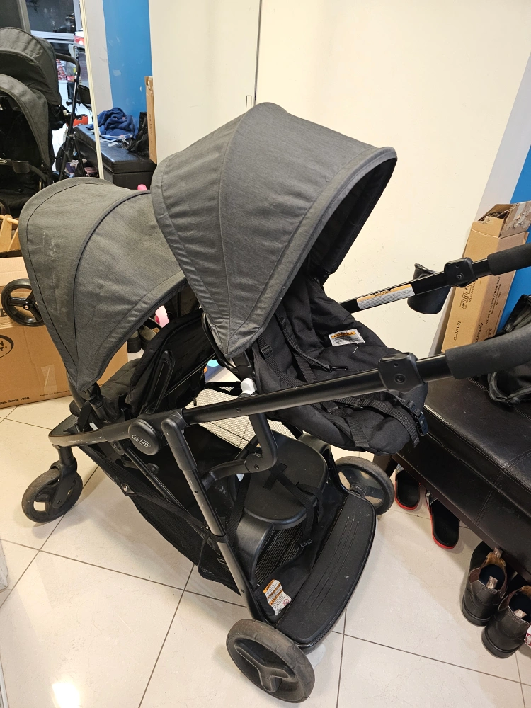 Selling a gently used Graco DuoGlider double stroller in black and grey. It's in great condition and perfect for families with two little ones! It's a practical and reliable stroller for everyday use.