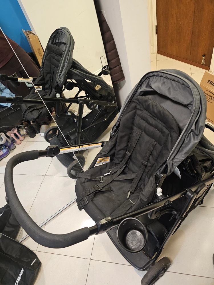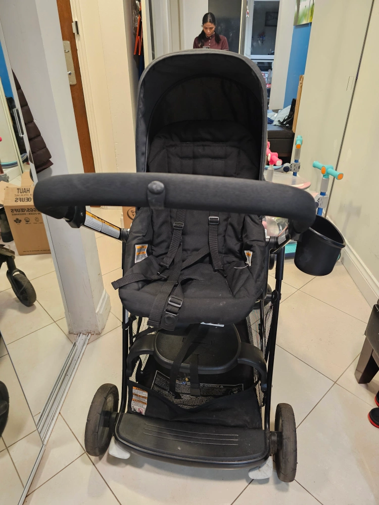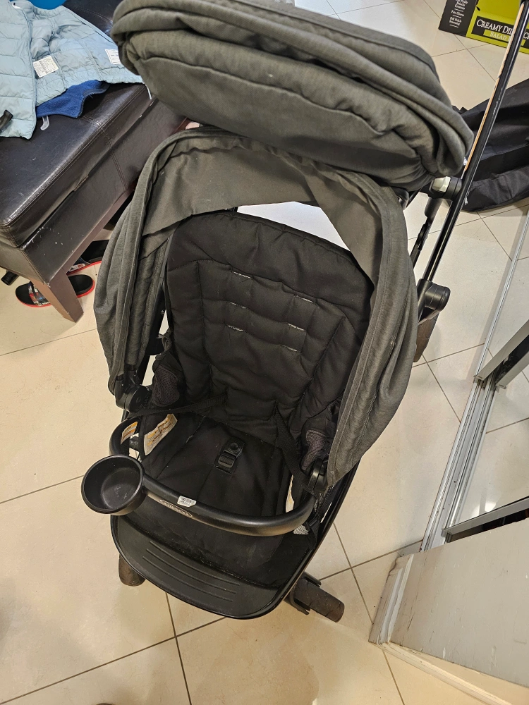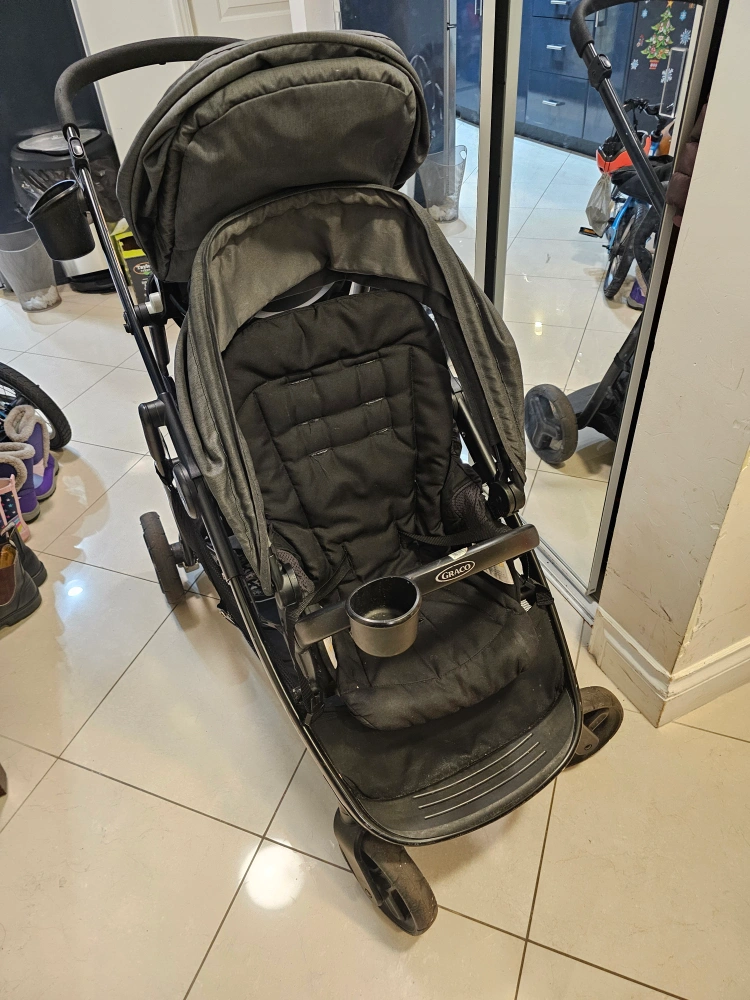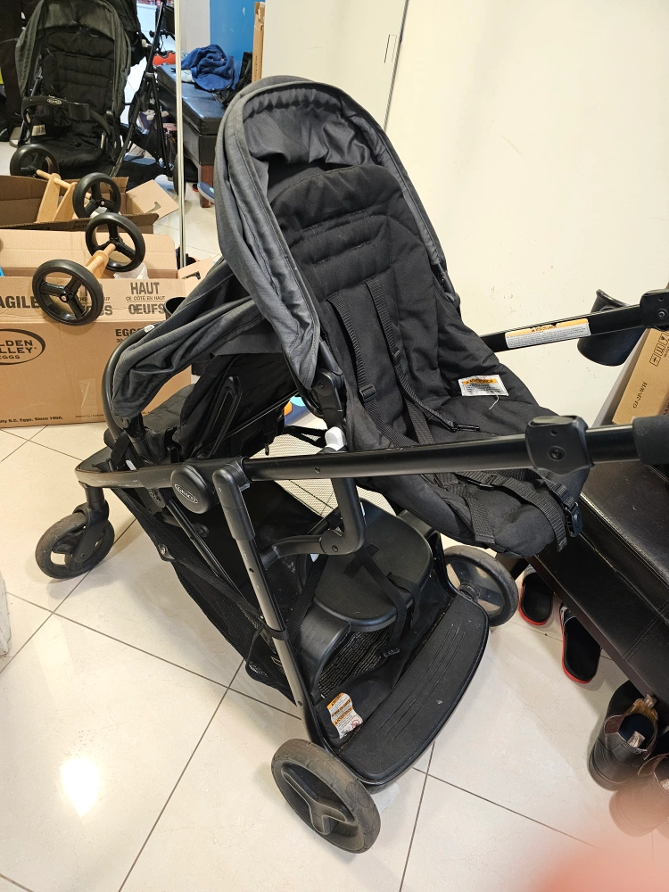 Selling a gently used Graco DuoGlider double stroller in black and grey. It's in great condition and perfect for families with two little ones! It's a practical and reliable stroller for everyday use.