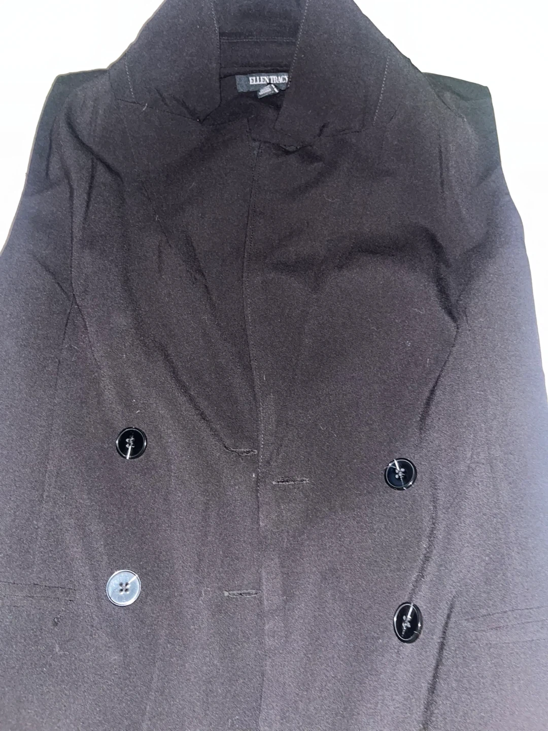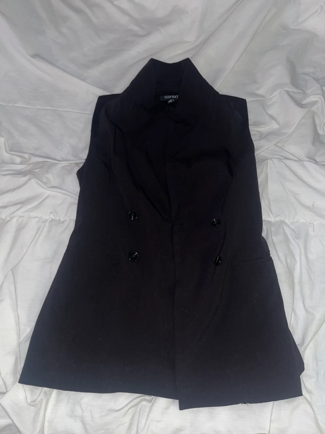 This is a black sleeveless blazer from Ellen Tracy. It features a double-breasted closure with two buttons. It also has a tie closure at the back for an adjustable fit. Made in China.