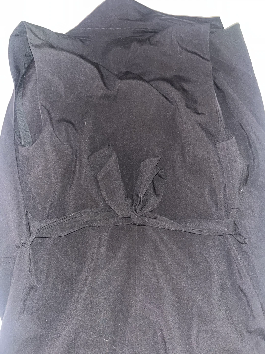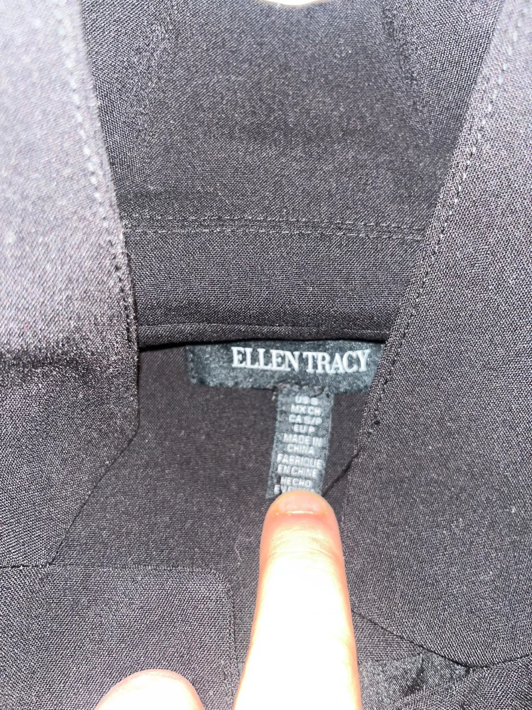 This is a black sleeveless blazer from Ellen Tracy. It features a double-breasted closure with two buttons. It also has a tie closure at the back for an adjustable fit. Made in China.