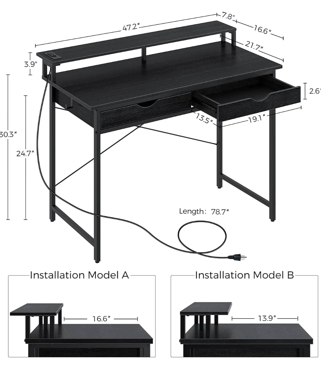 Black Compact Desk with Monitor Riser and Drawer