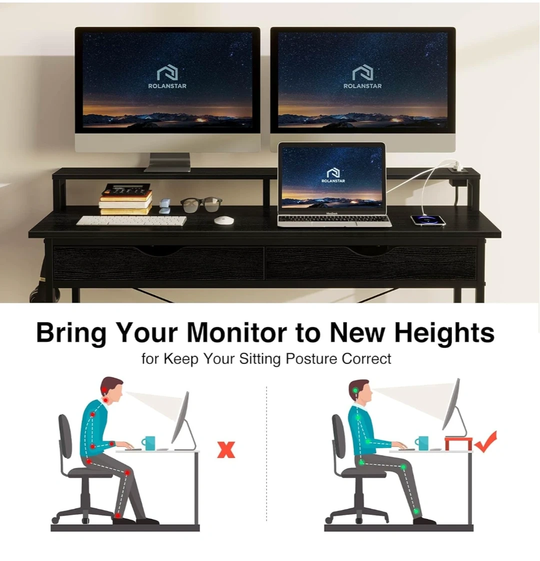 This black compact desk features a monitor riser to help with posture. The desk includes two drawers for storage and has built-in USB ports for convenience. This would be useful for a small office or a student's dorm room.