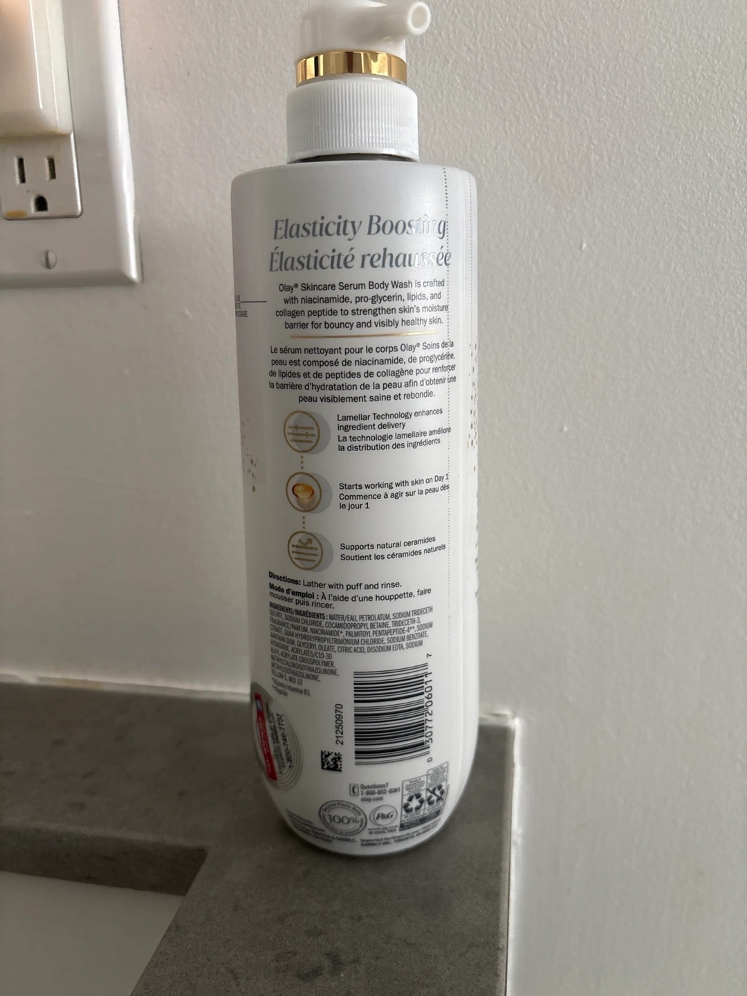Olay Elasticity Boosting Body Wash is crafted with niacinamide, pro-glycerin, lipids, and our collagen peptide serum complex. It supports natural ceramides. Starts working on skin day 1 for bouncy, healthy-looking skin.