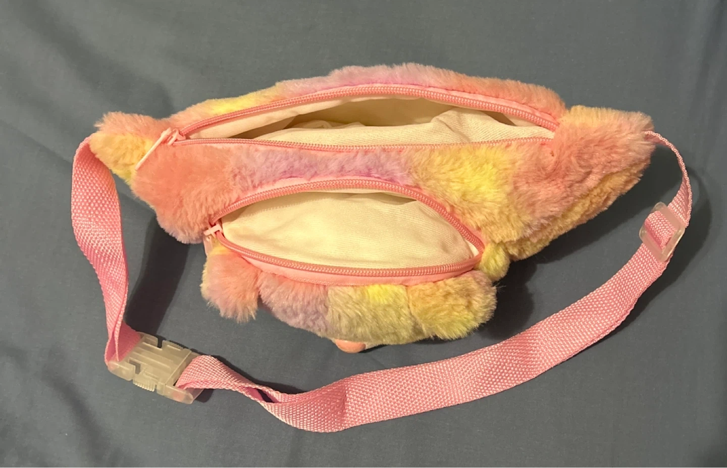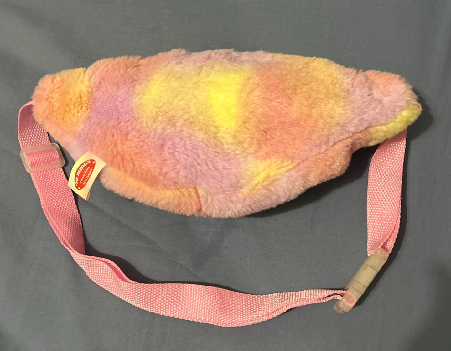 This fuzzy fanny pack has a fun tie-dye pattern in pink, yellow, and purple. It features two zippered compartments and an adjustable pink strap with a plastic buckle. It's a cute accessory for carrying essentials!