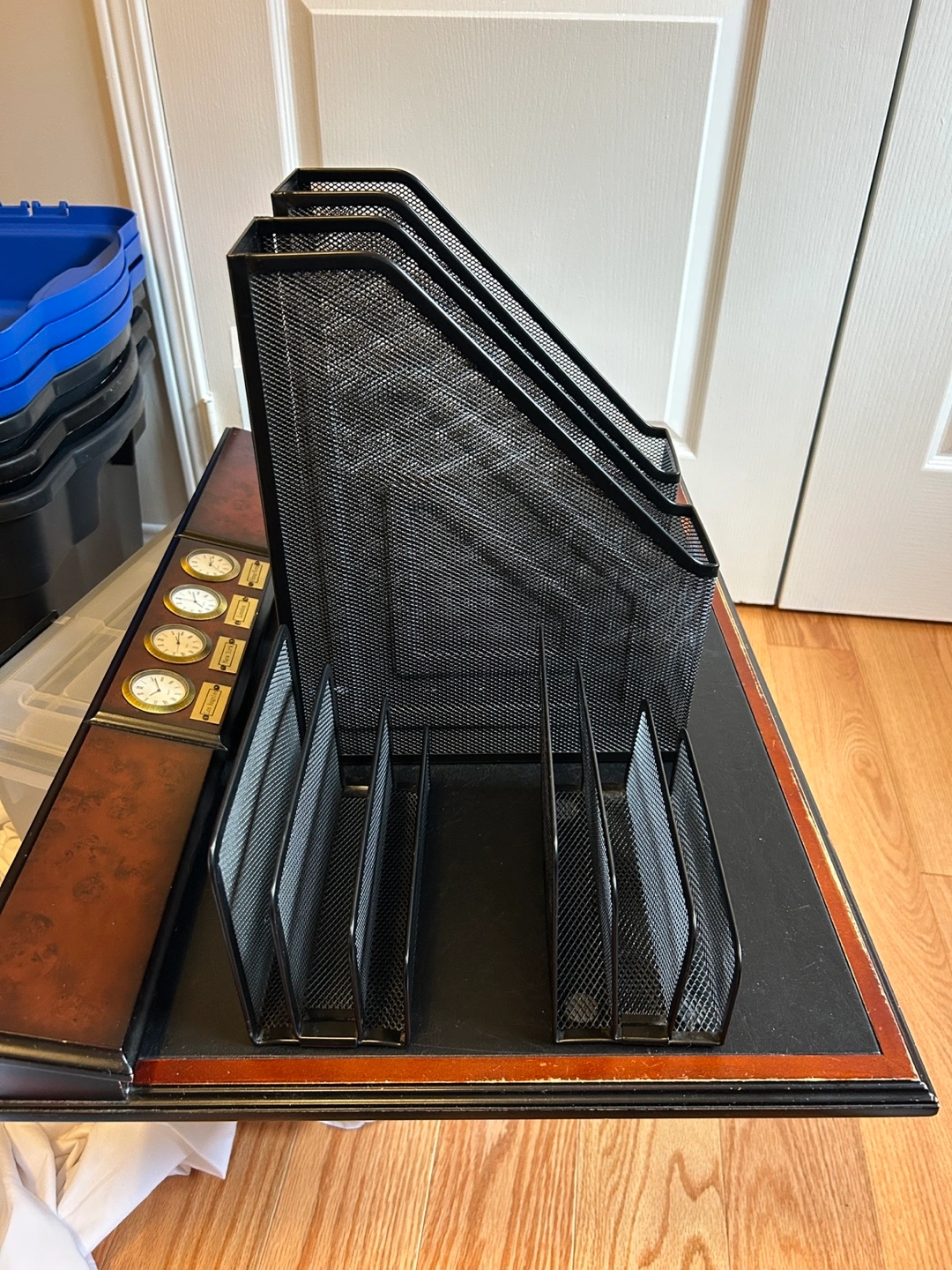 Black metal desk organizer. Includes a letter tray and a multi-compartment organizer. Sell for $20 each at Staples