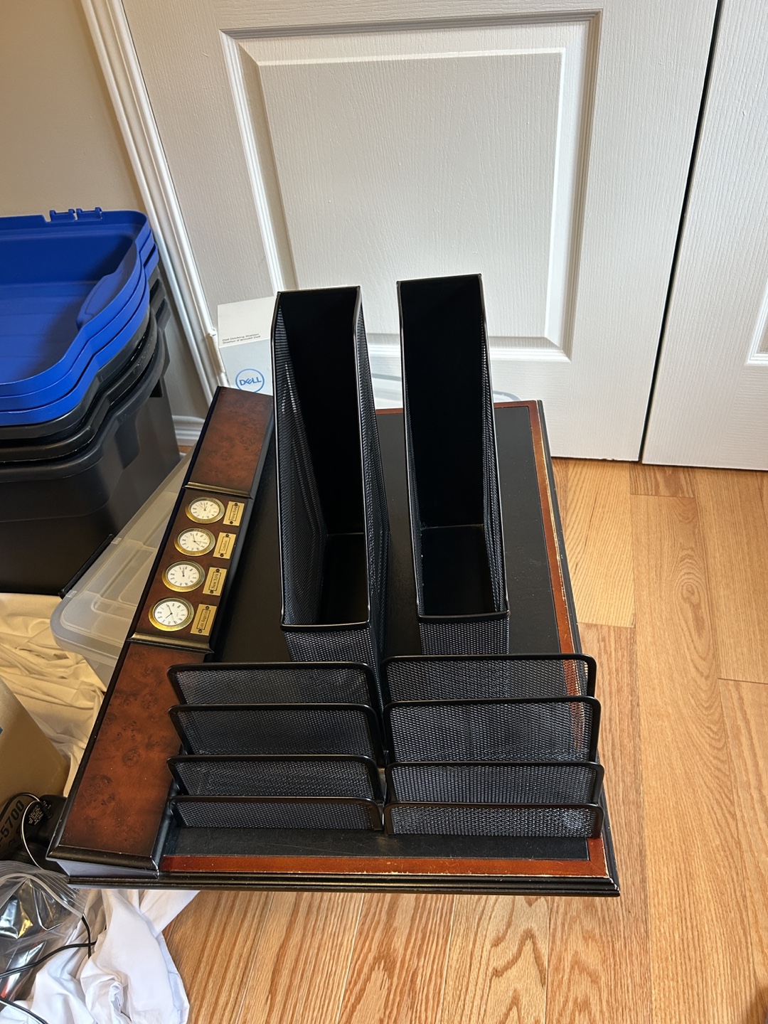 Black metal desk organizer. Includes a letter tray and a multi-compartment organizer. Sell for $20 each at Staples