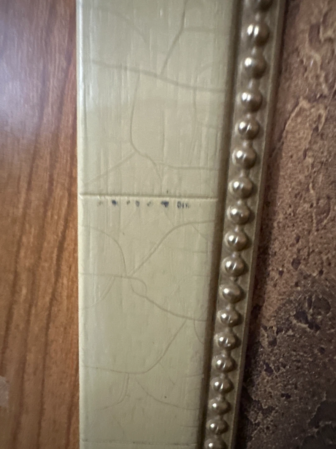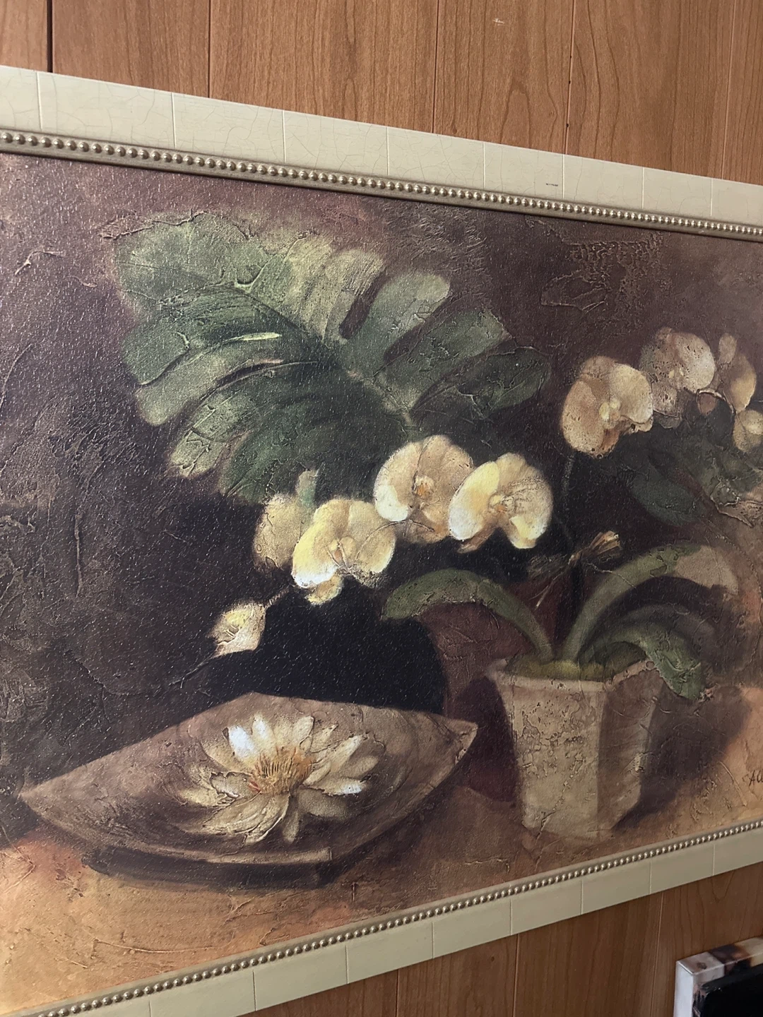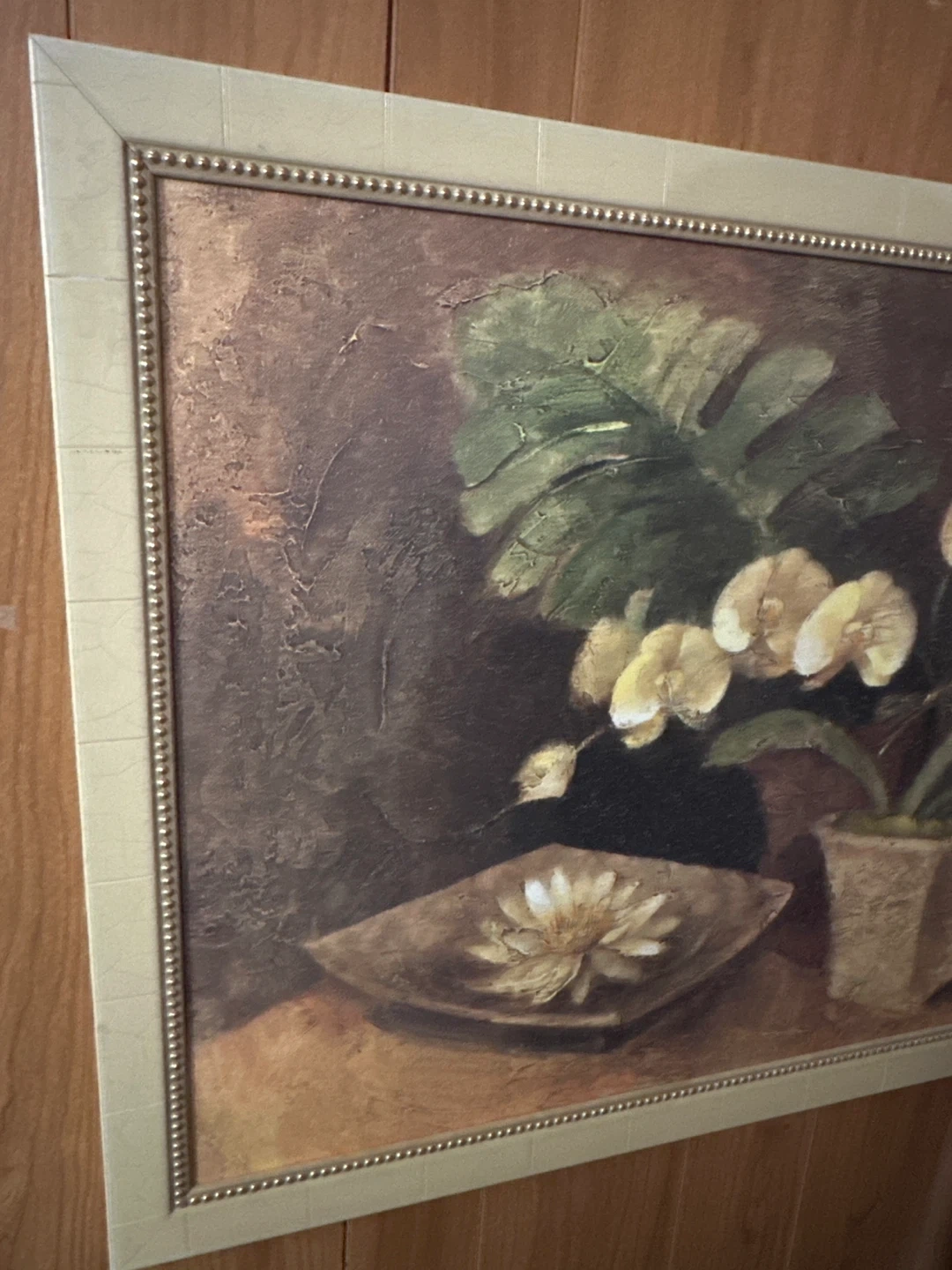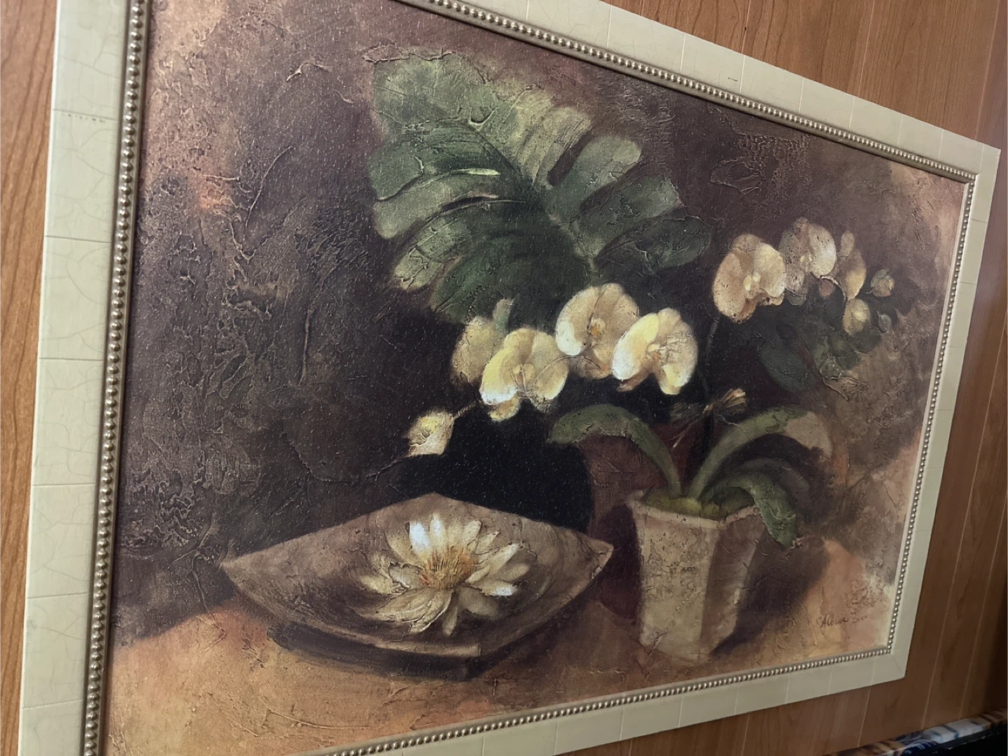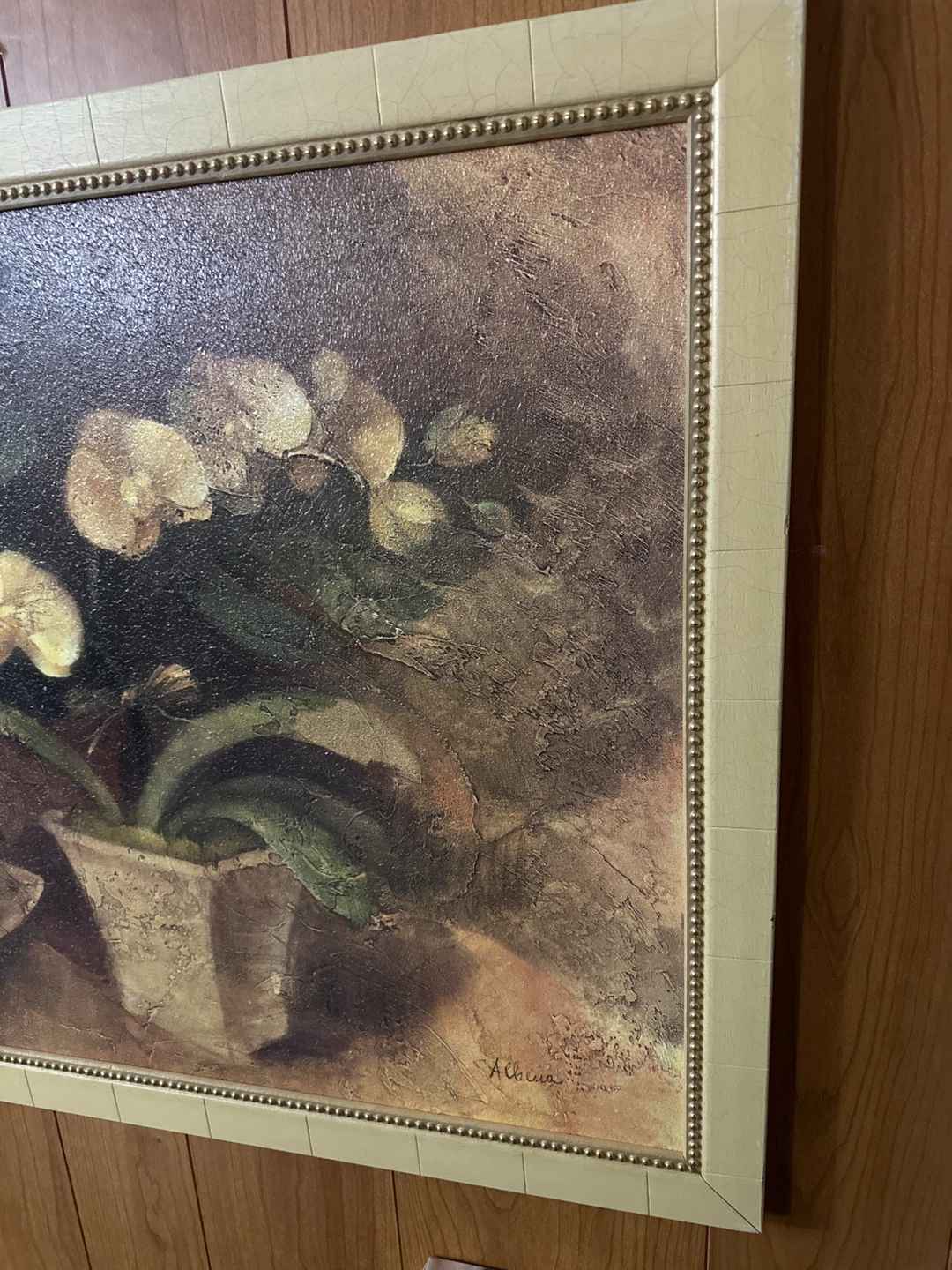 Beautiful floral painting signed by Albena. It features a lovely arrangement of orchids and other greenery in a decorative pot and bowl. The frame is a light cream colour with a beaded inner edge. It would look great in any room!