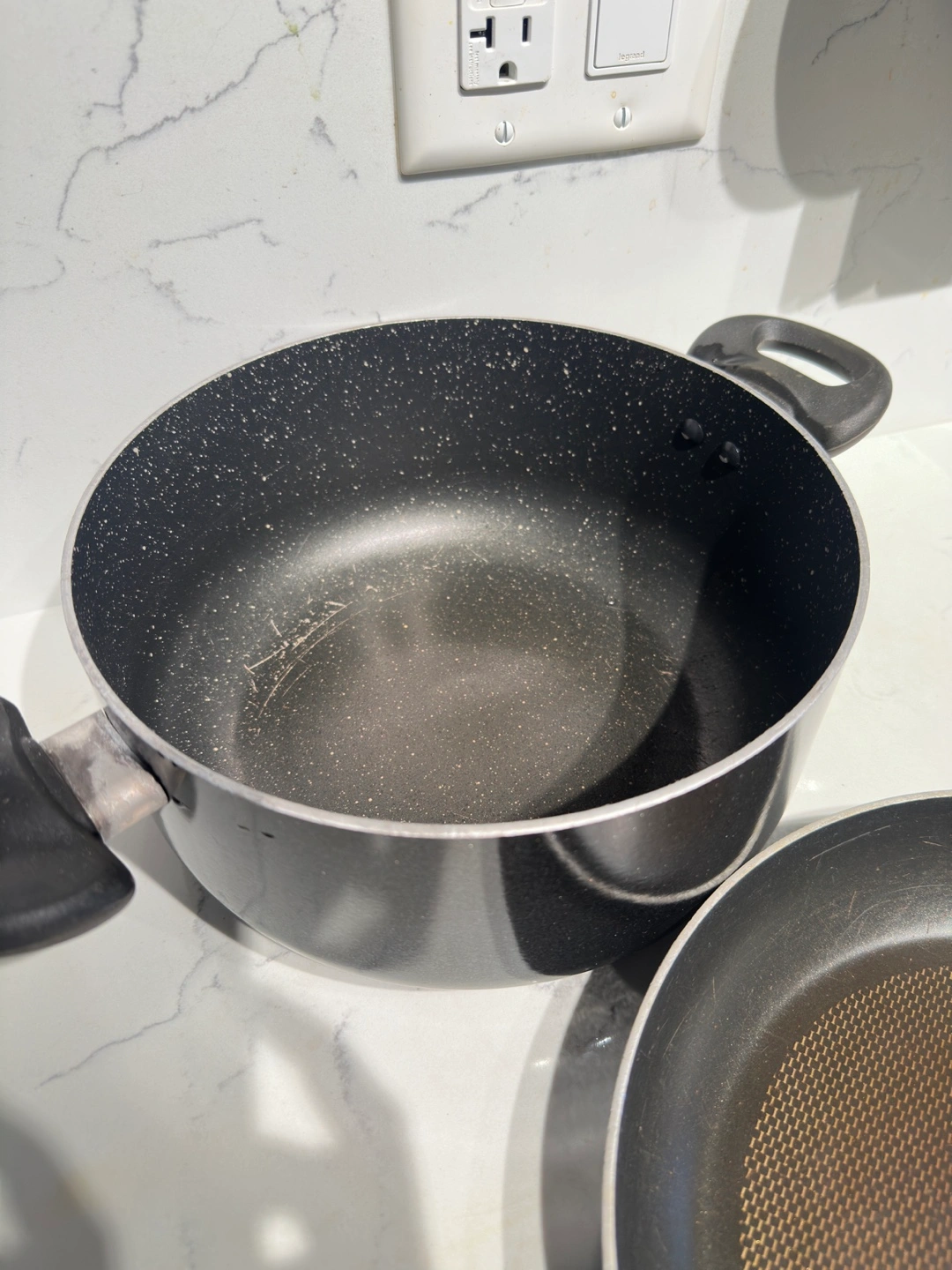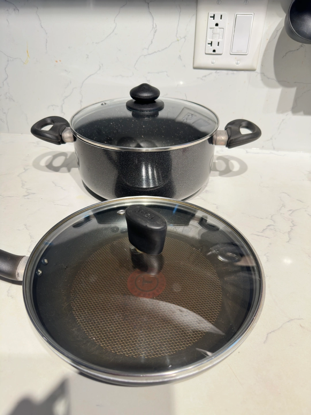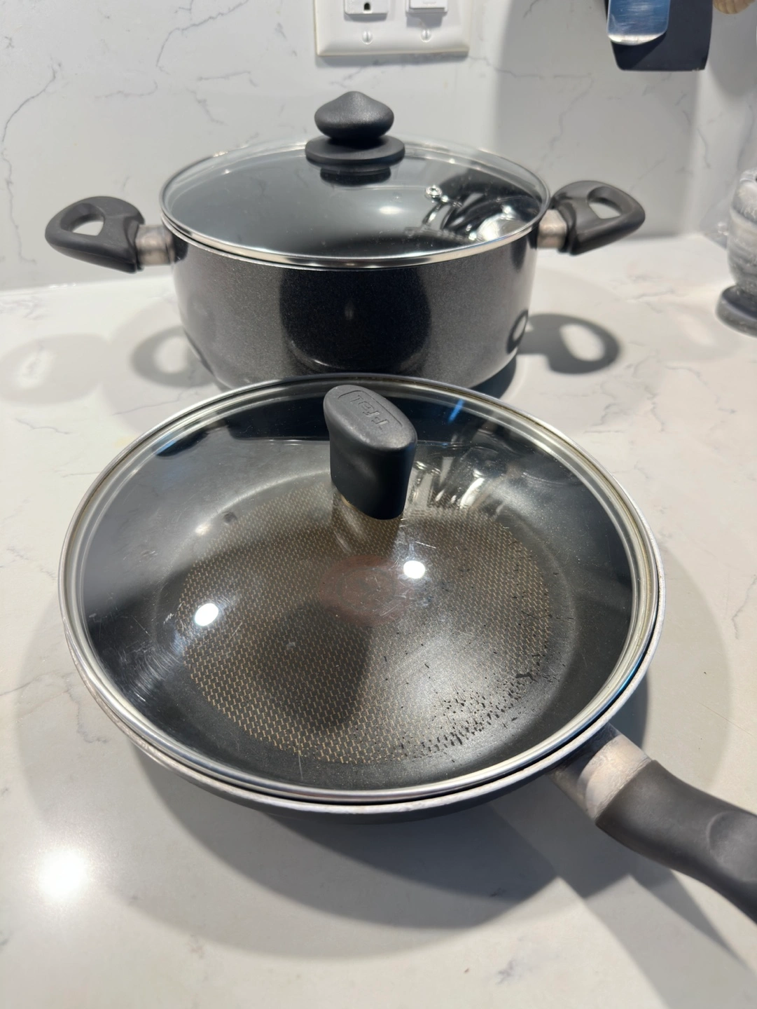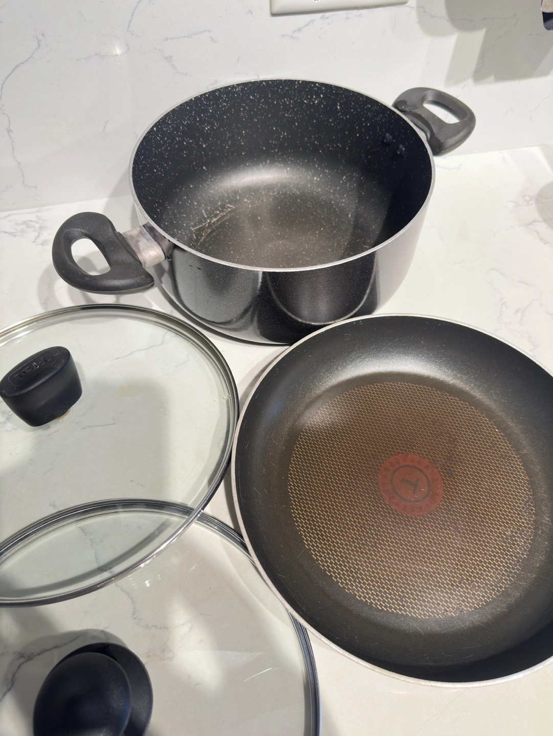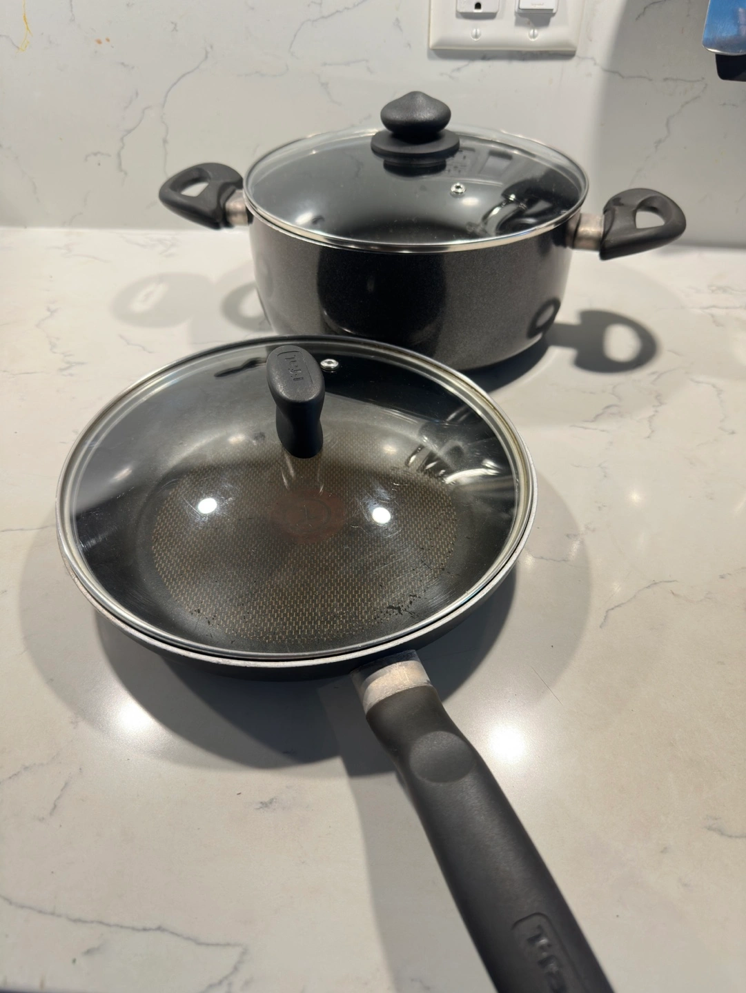 Includes one cooking pot and one frying pan. Both have glass lids. Good used condition.