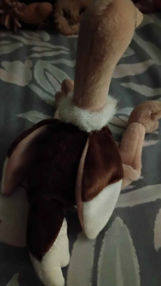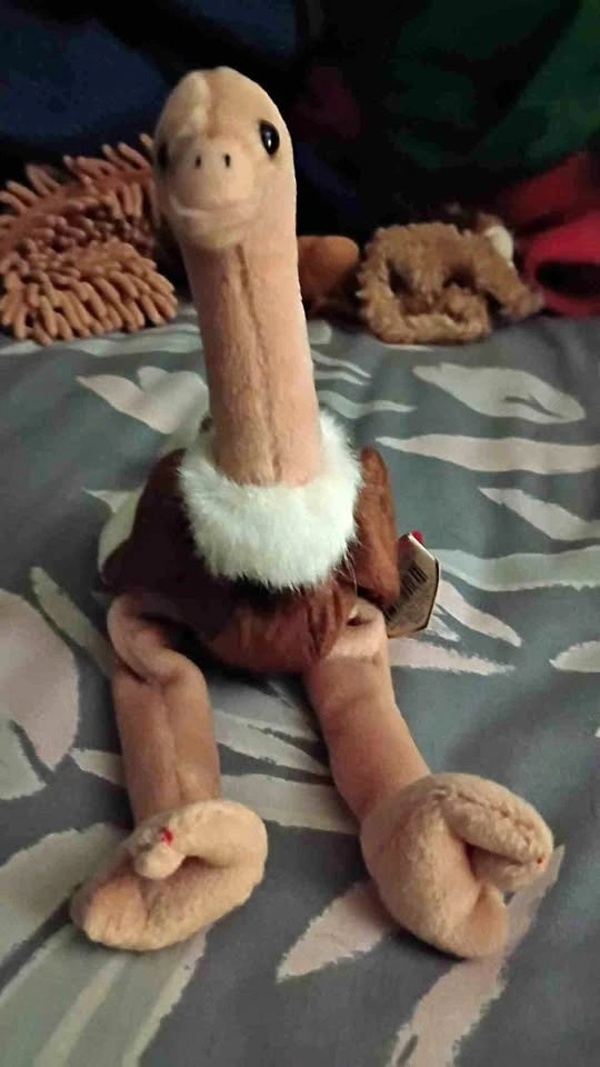 An original Ty Beanie Baby plush toy. The toy is an ostrich with a brown body, long peach-colored legs and neck, brown and black button eyes, and a peach-colored beak with black stitching for nostrils. It also has fluffy white fur around its neck. It was introduced on December 31, 1997, and retired on March 31, 1999. CASH ONLY PLEASE!