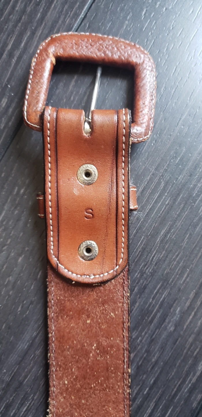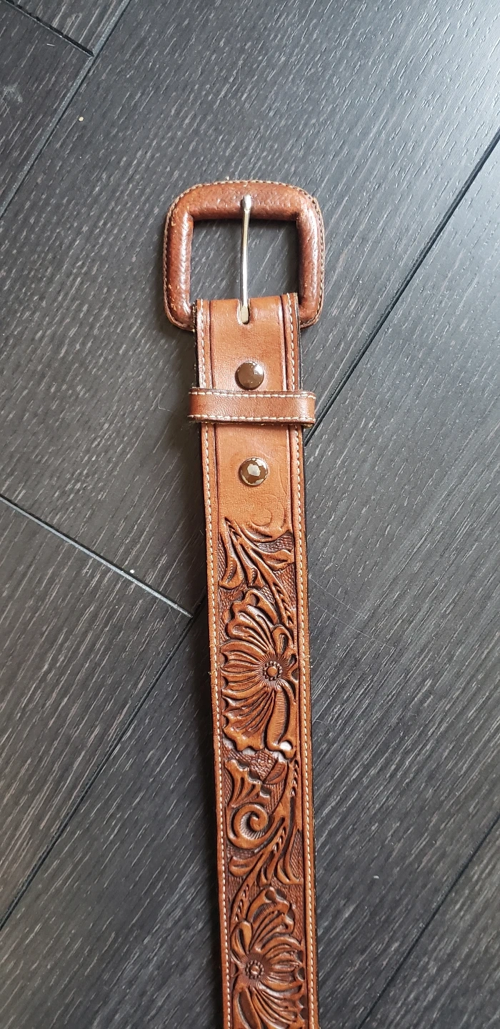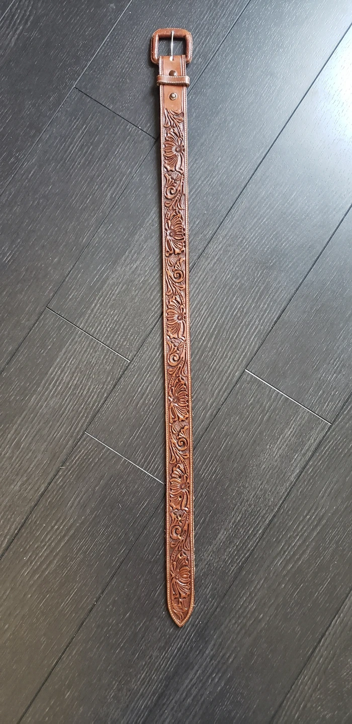 Brown leather belt. Intricate floral tooling. Square buckle. Hand-tooled. First Issue Private Label. Size Small, best for xs-small waists.