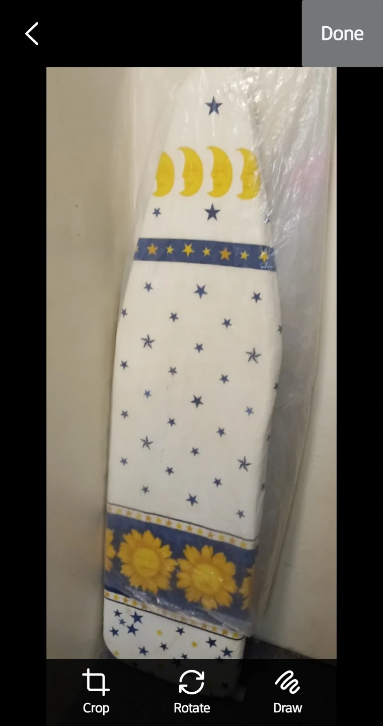 This is an ironing board cover featuring a charming moon and star pattern. It's designed to fit standard ironing boards. The cover's fabric has a white base with blue stars and a decorative band with yellow moons and sunflowers. It comes in a protective plastic sleeve.