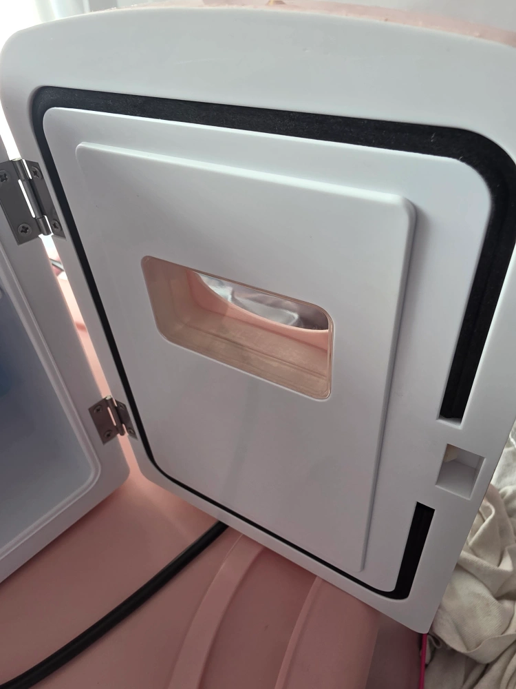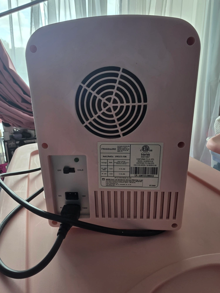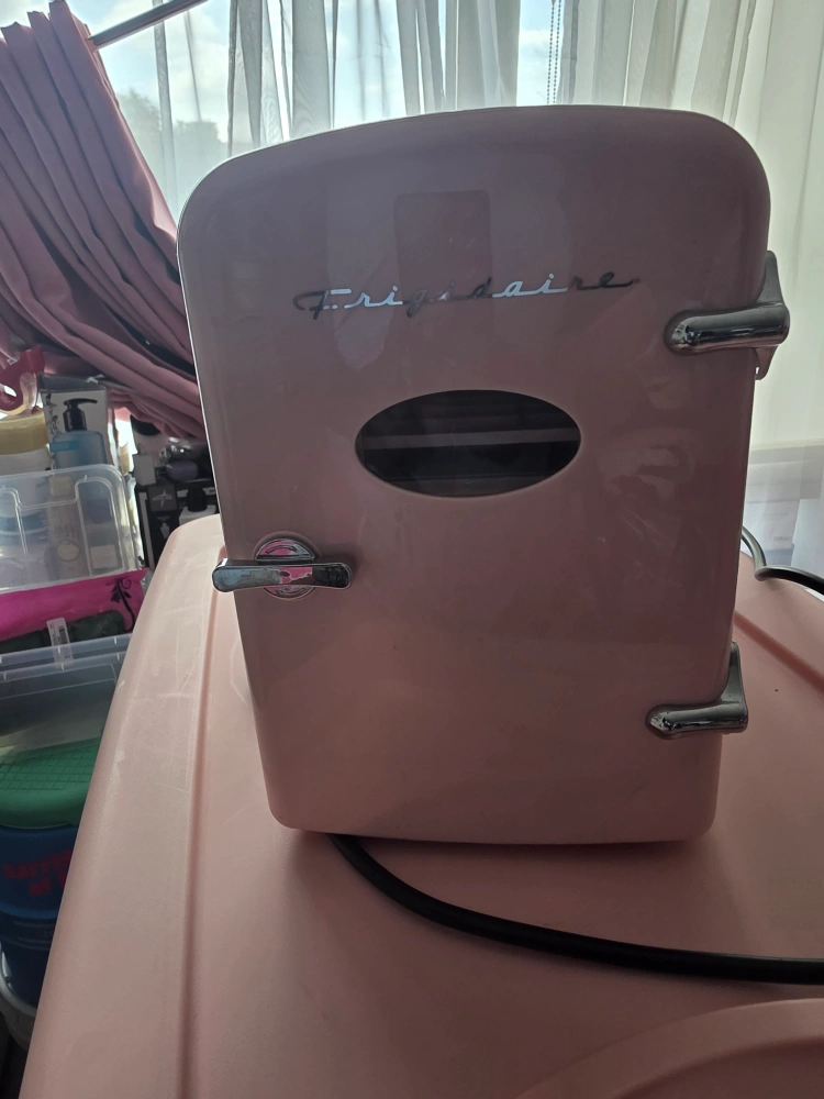 Selling a cute pink Frigidaire portable retro mini fridge! Model number is EFRES173-PINK. It's perfect for keeping drinks and snacks cool in your room or office. Great for skincare products too!