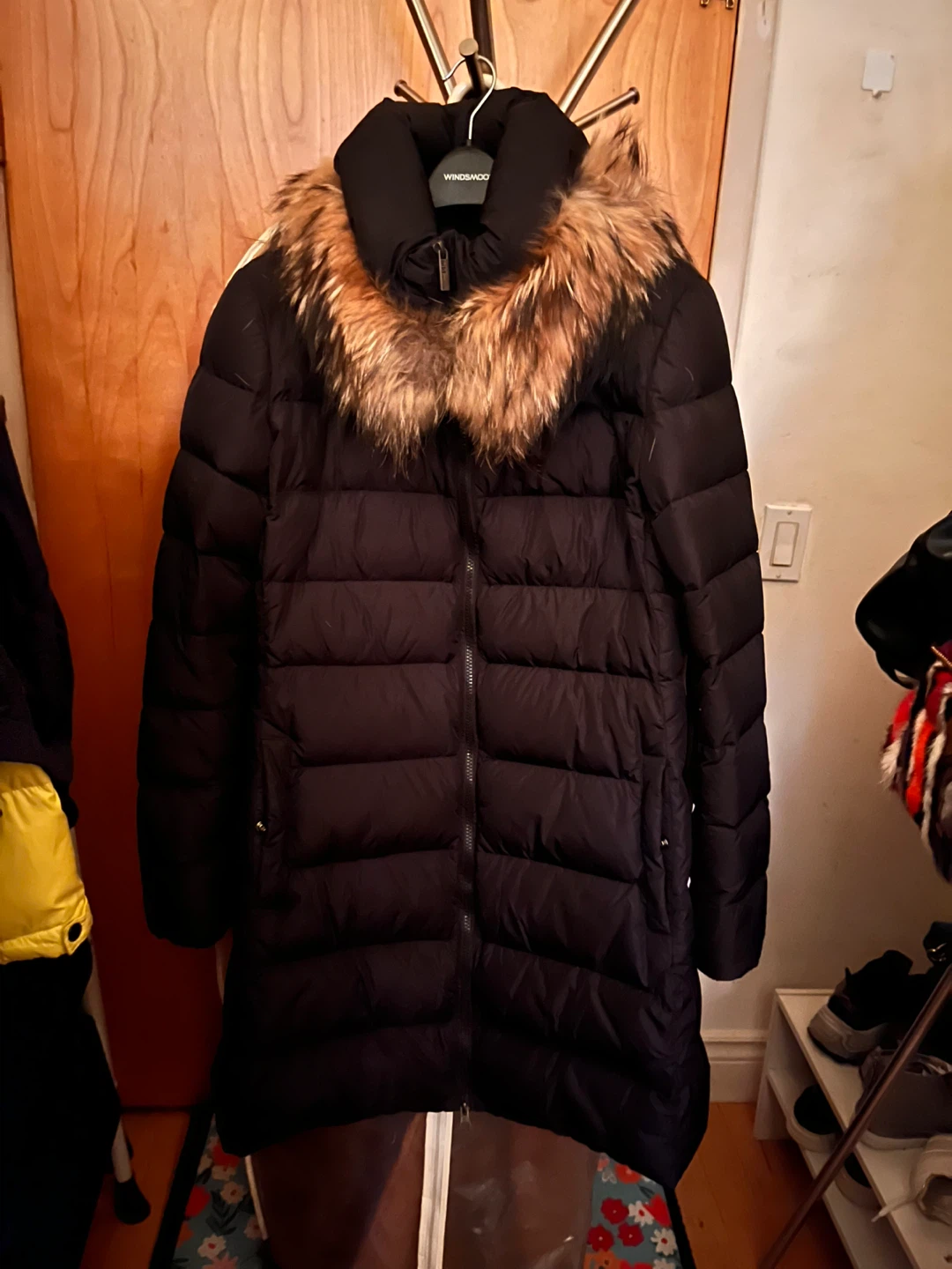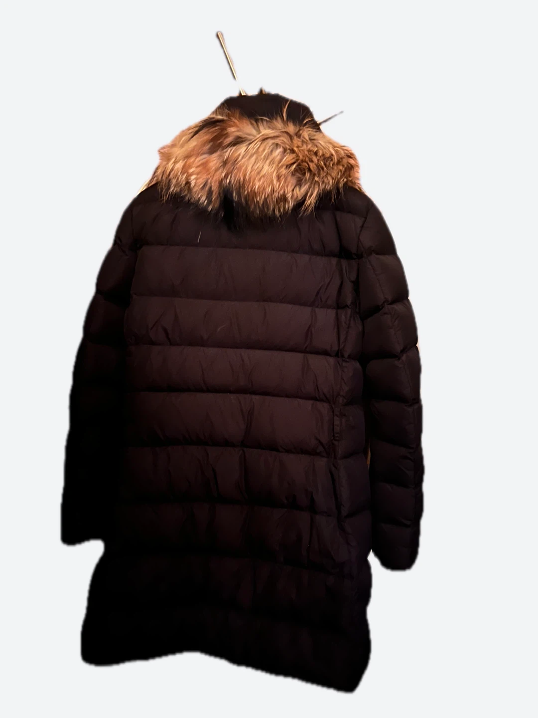 Here's a lovely black down puffer coat! It features a fur-trimmed hood and a classic puffer design. Perfect for staying warm during the colder months!