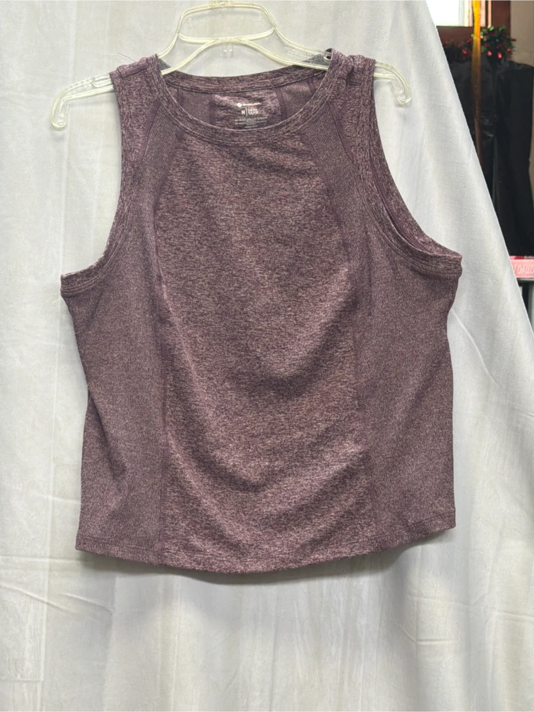 Members mark Active heathered purple tank top. This women's tank is a size medium. It's made from a blend of polyester and spandex for comfort and stretch.
