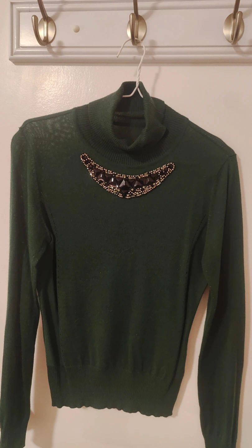 Selling a stylish green turtleneck sweater. It features unique embellishments around the neckline, adding a touch of elegance to your outfit. Perfect for staying cozy and fashionable!