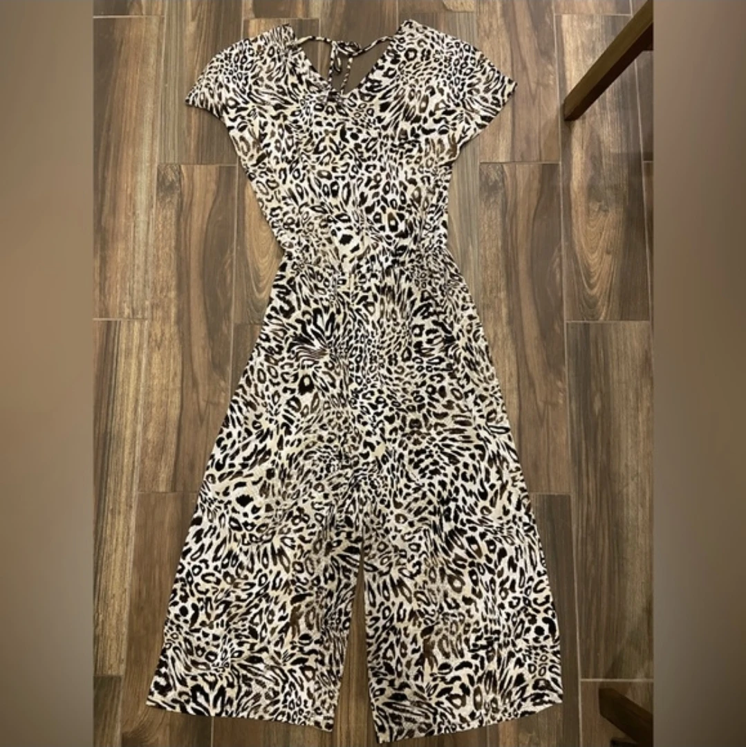 Kim & Co. jumpsuit in brown and black leopard print. Size XS/TP. 13-16" waisted, 20.5" ptp, 19" inseam. Lots of stretch and includes pockets. Excellent condition!