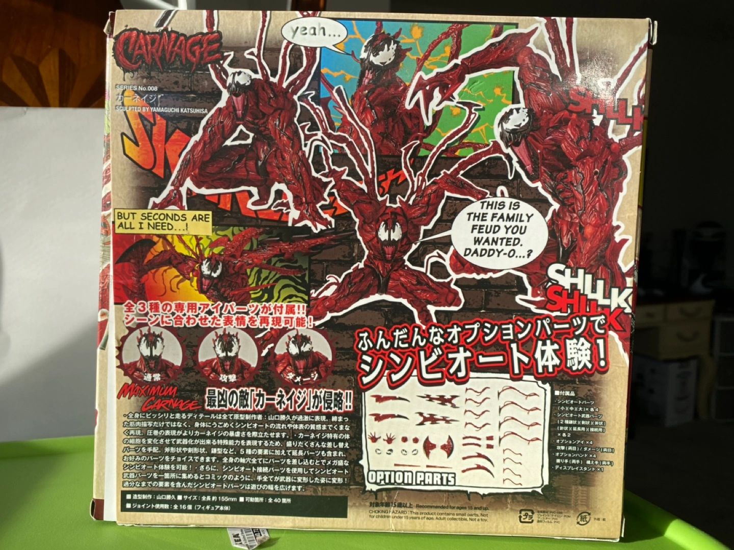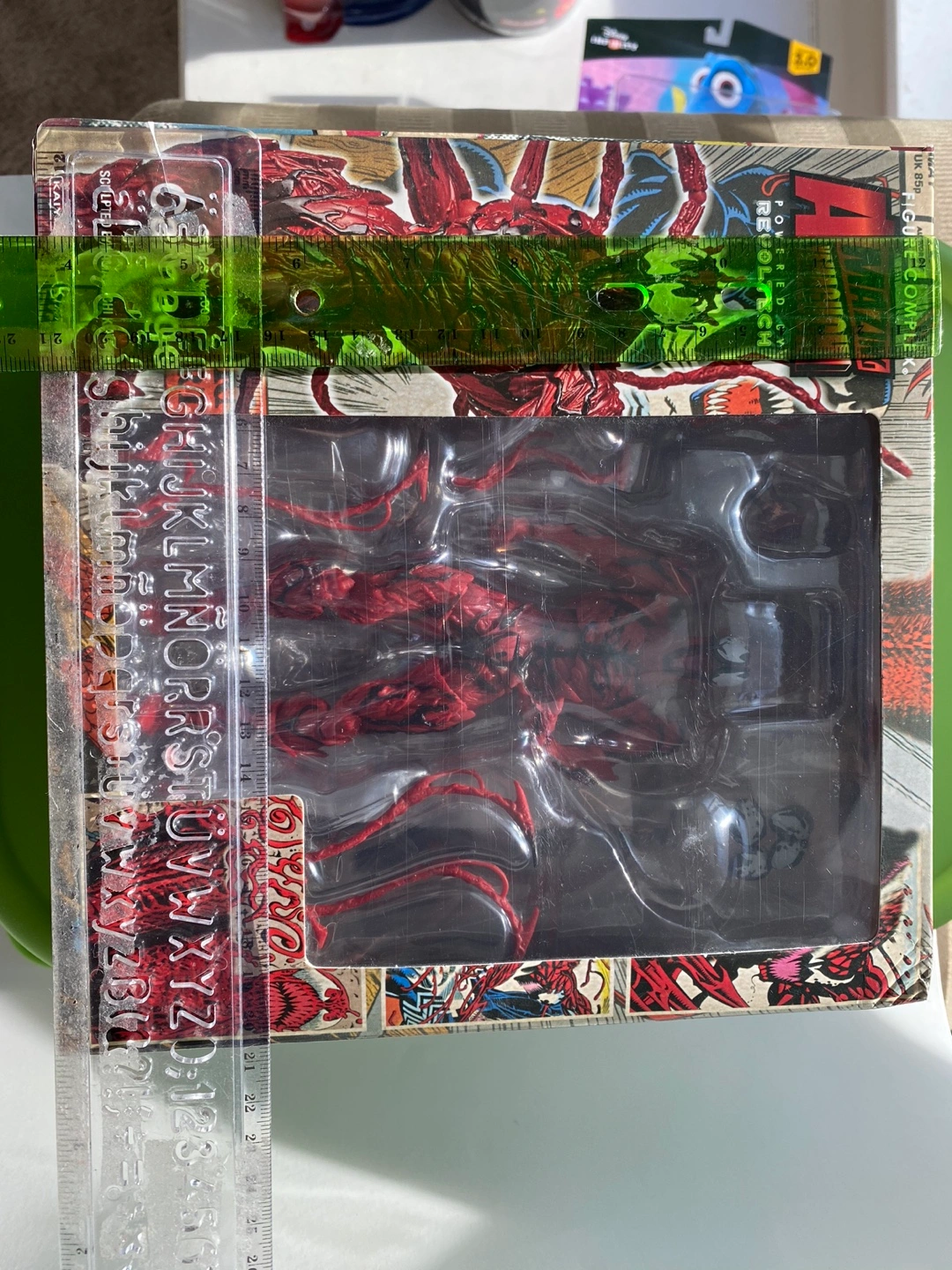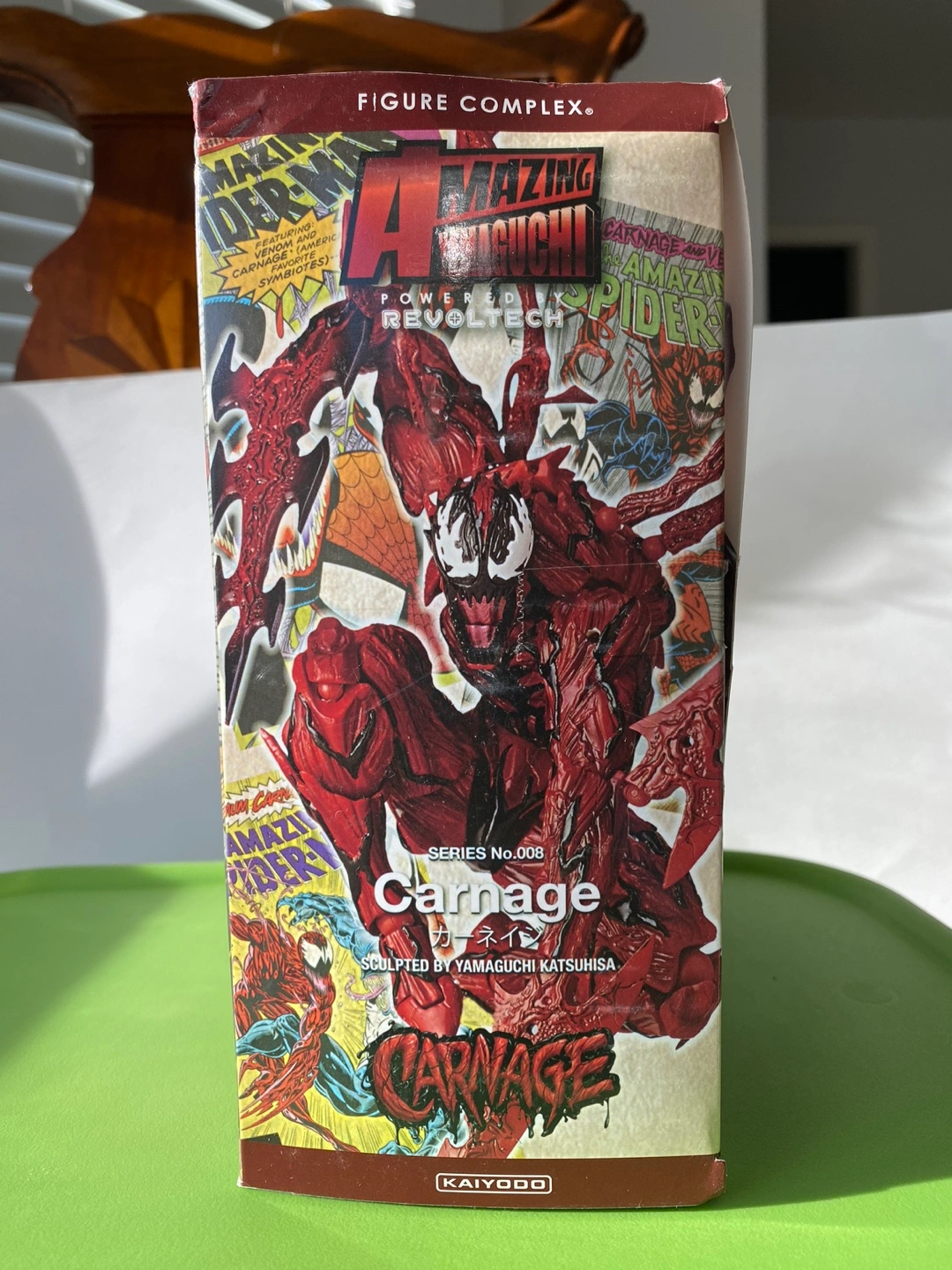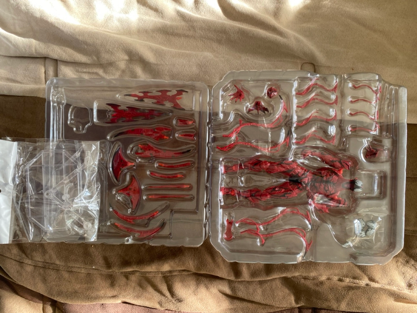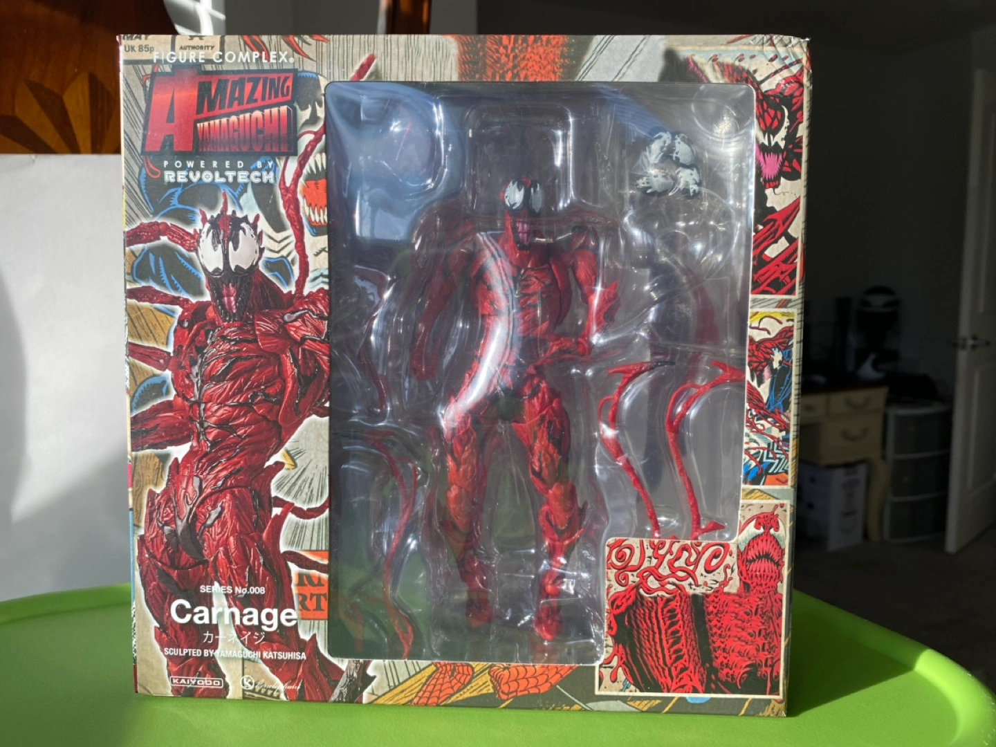 Carnage figure from China, NOT Revoltech. Includes multiple interchangeable parts and a display stand.