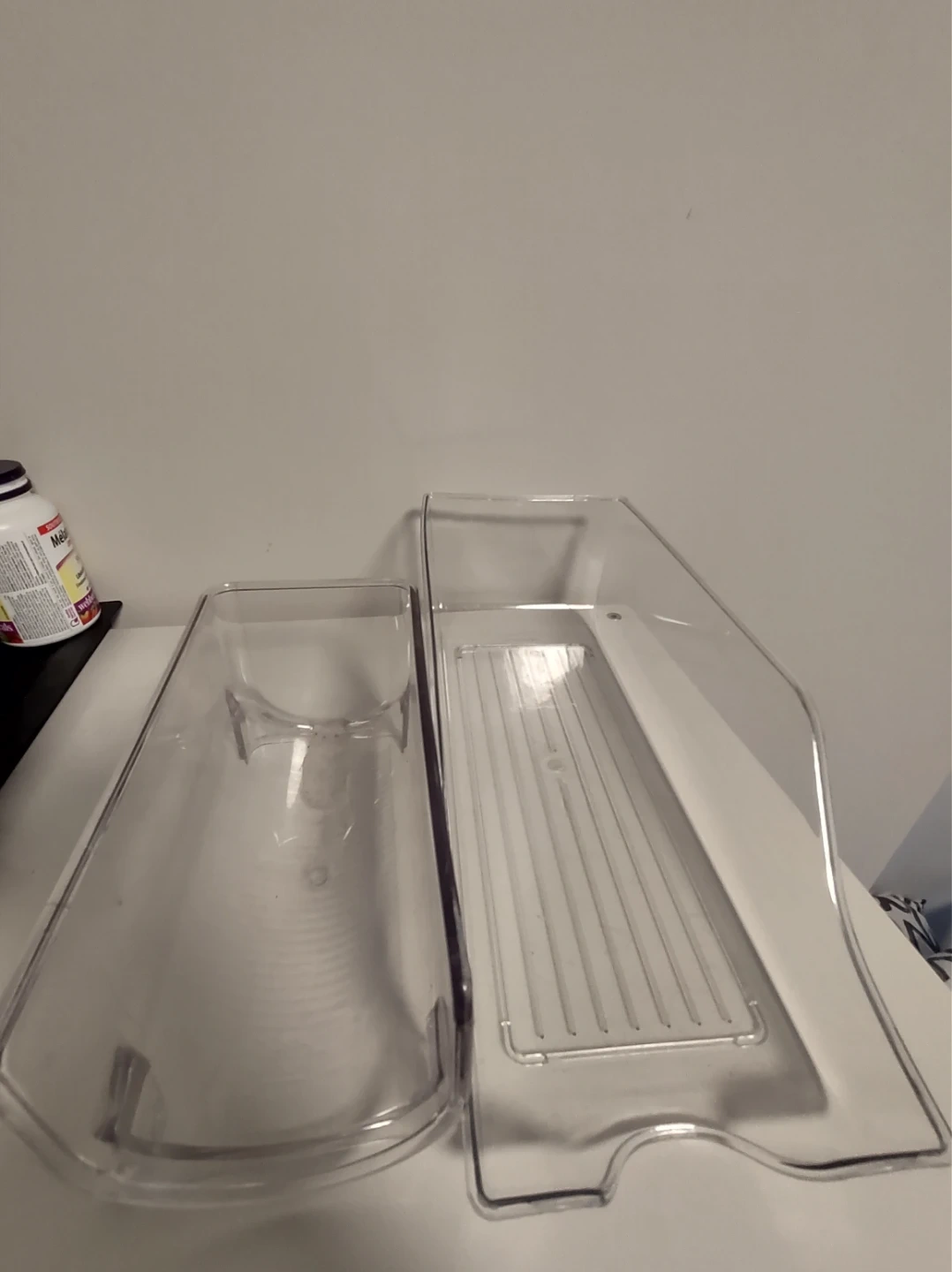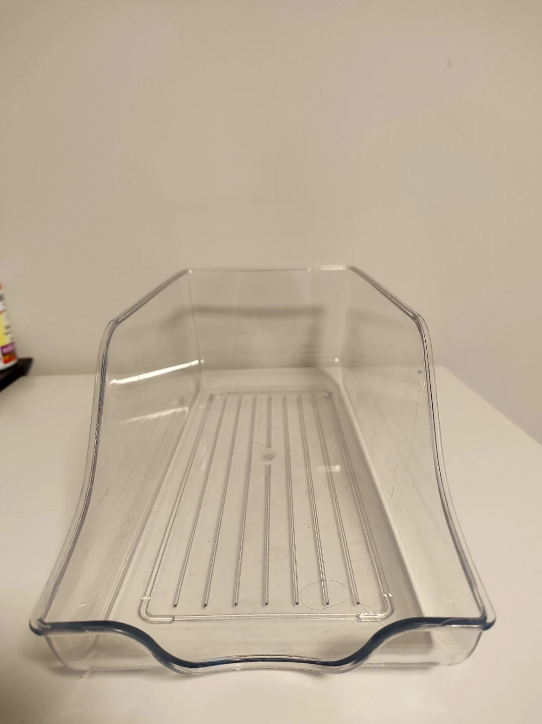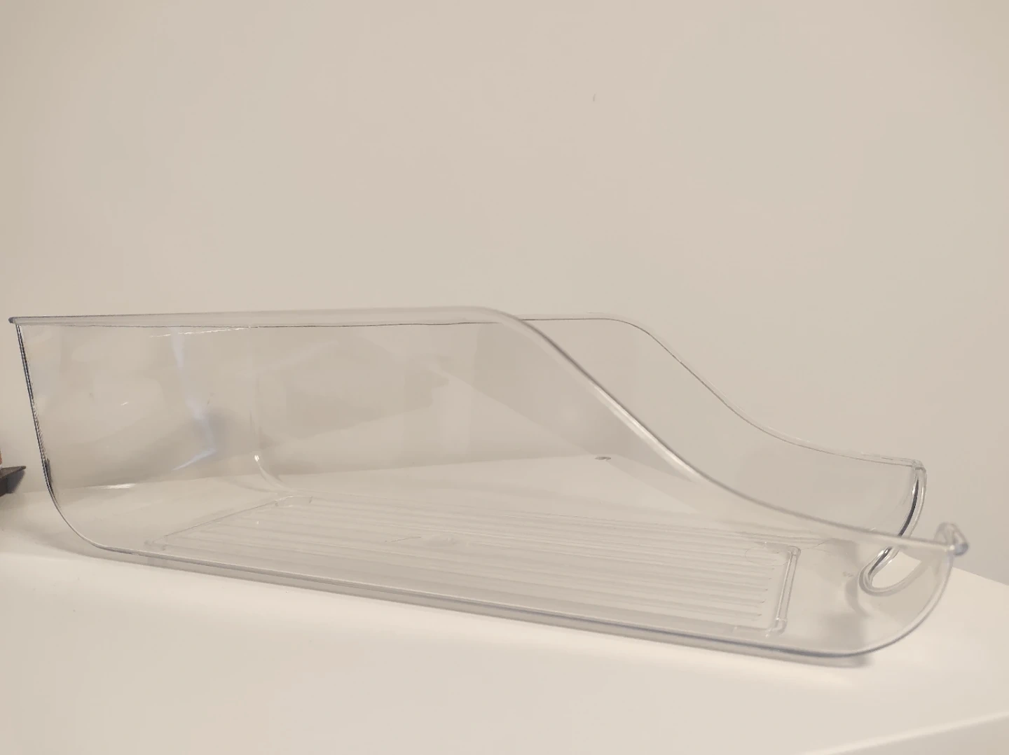 This clear plastic organizer is designed for fridge or pantry use. It's a rolling drawer with a ribbed base for stability. Makes accessing items easy!