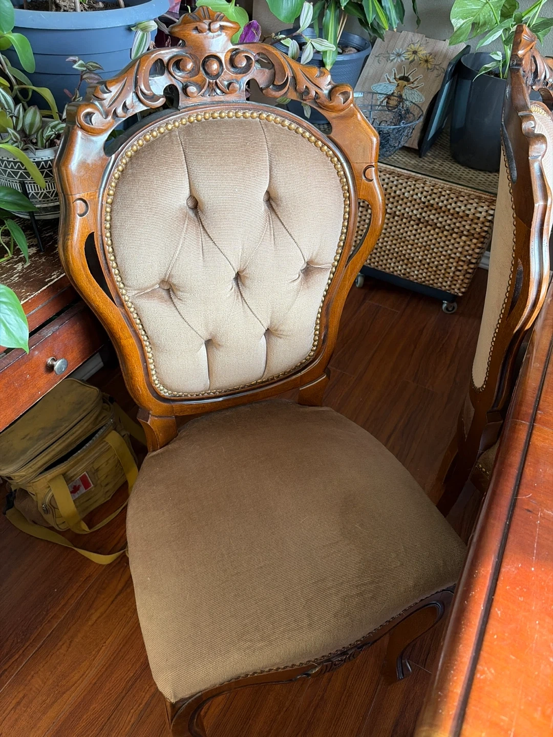 Needs to be refinished. Mahogany wood Ornate carved wood dining table with six upholstered chairs. Make an offer.