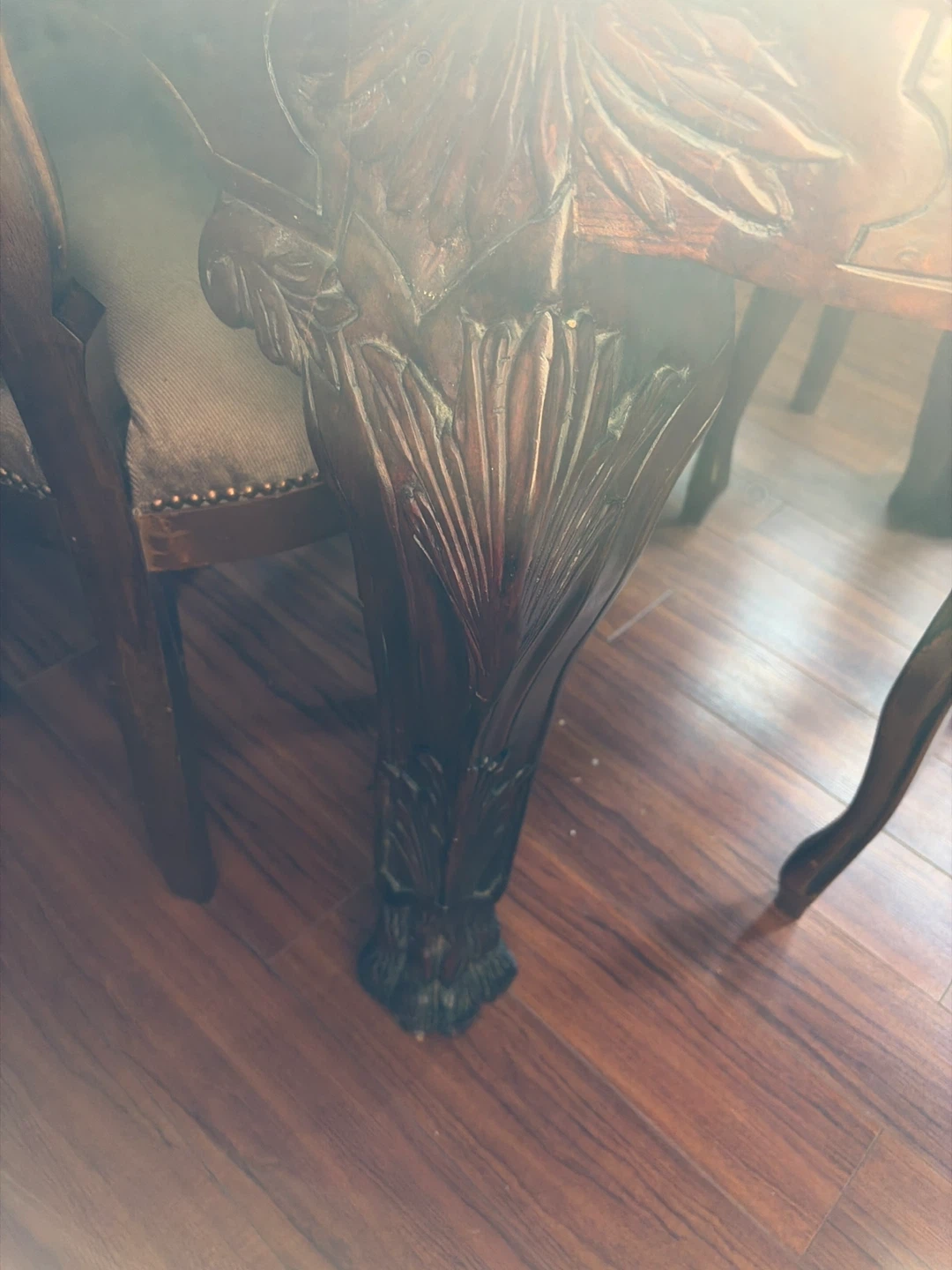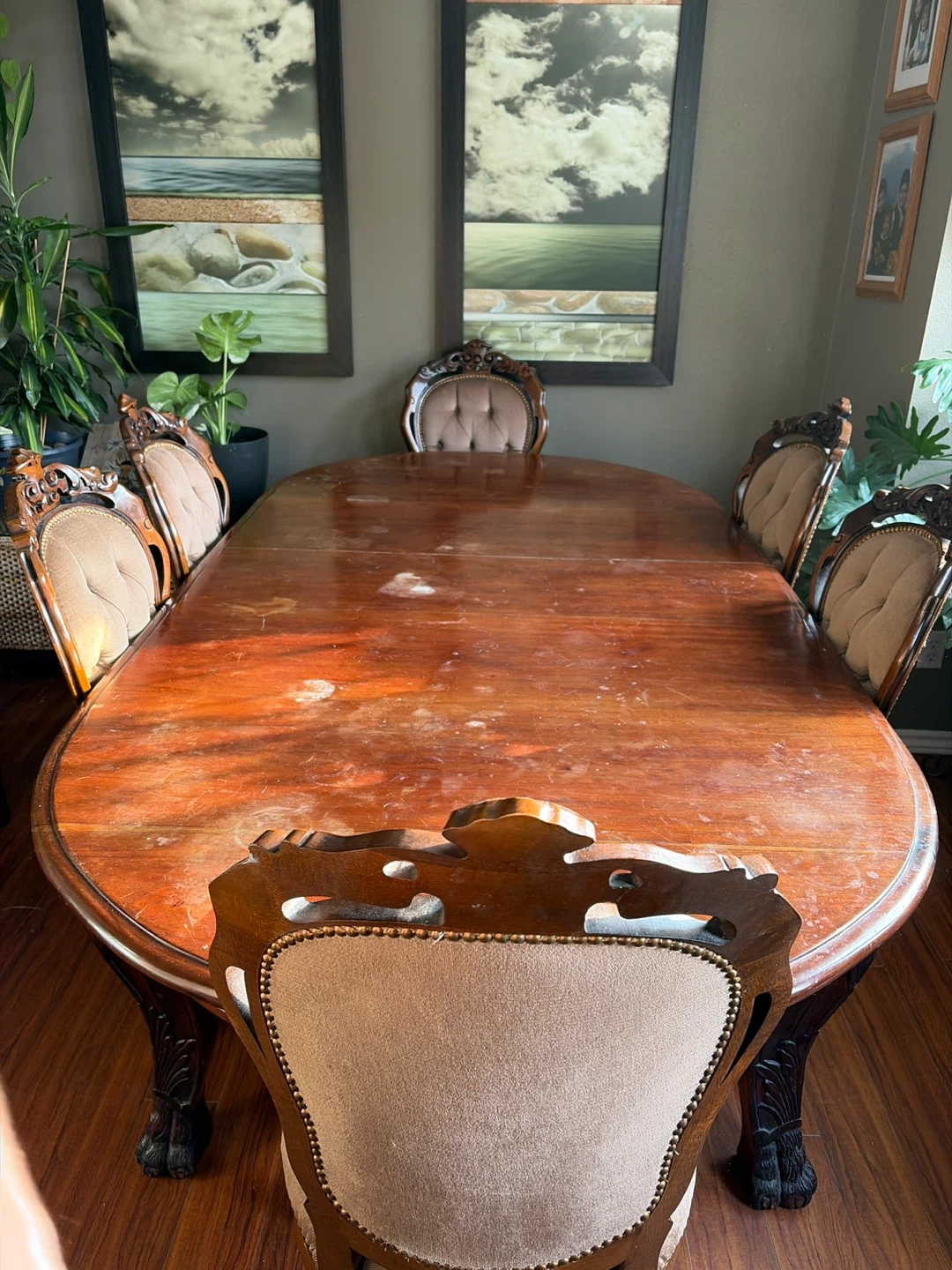 Needs to be refinished. Mahogany wood Ornate carved wood dining table with six upholstered chairs. Make an offer.