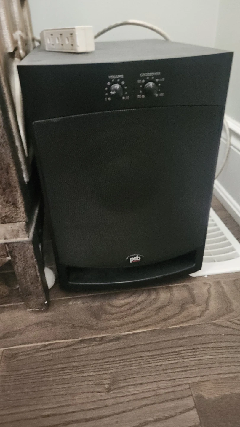 This listing includes a Yamaha Natural Sound AV Receiver RX-V567 and a set of PSB speakers, including a subwoofer. They're black in colour. This system provides a great audio experience.