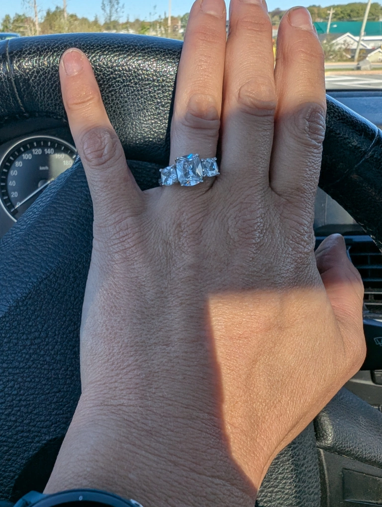 30 OBO. A ring featuring cubic zirconia stones. It has a central, larger stone flanked by two smaller ones. It's a lovely piece for adding a bit of sparkle to your look! perfect as a cocktail ring or engagement. size 7 just too big for me.