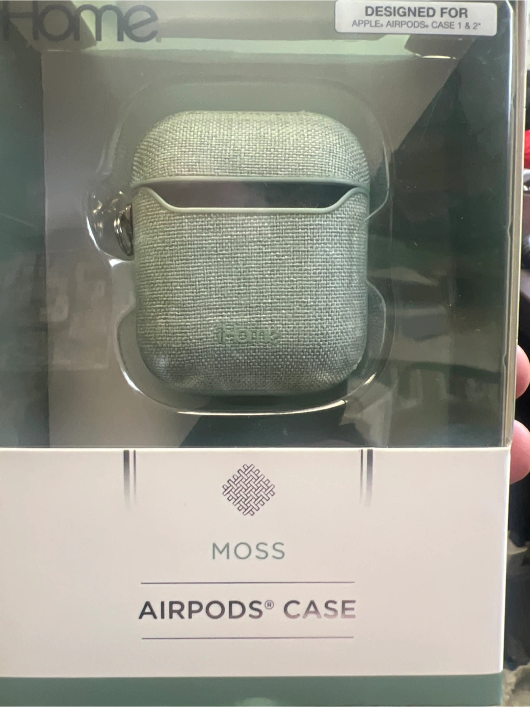 This is an iHome AirPods case designed for Apple AirPods Case 1 & 2. It's a moss colour and features a fabric-like textured exterior. Includes a keyring attachment.
