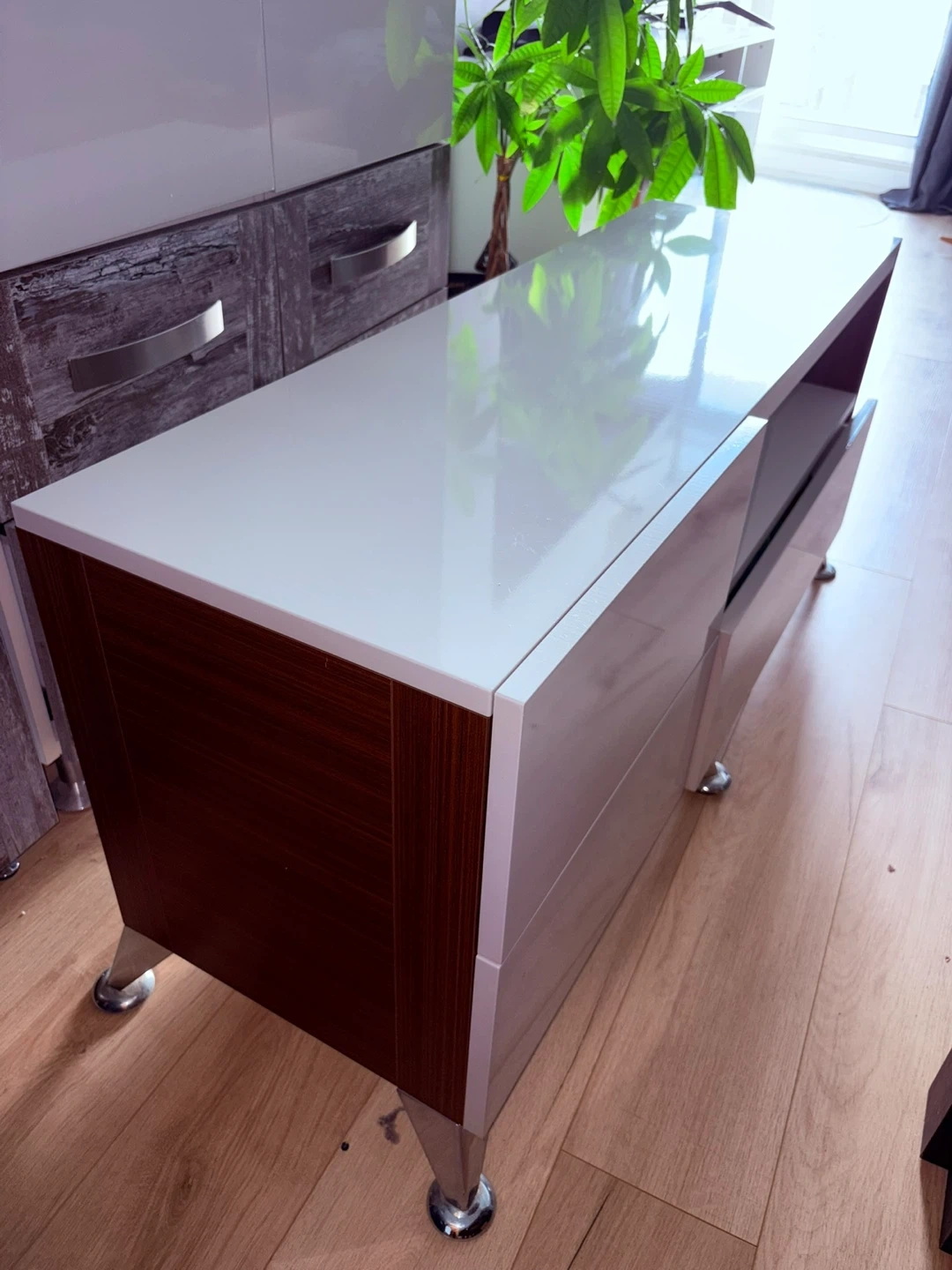 LG smart tv with a white stand for it features drawers and open shelving for storage. Perfect for organizing your entertainment setup.