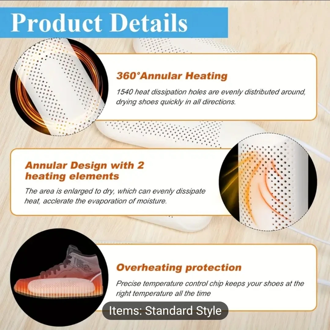 Keep your shoes fresh and dry with this handy shoe dryer! It features 360° annular heating and an annular design with 2 heating elements for efficient drying. It also has overheating protection to keep your shoes at the right temperature