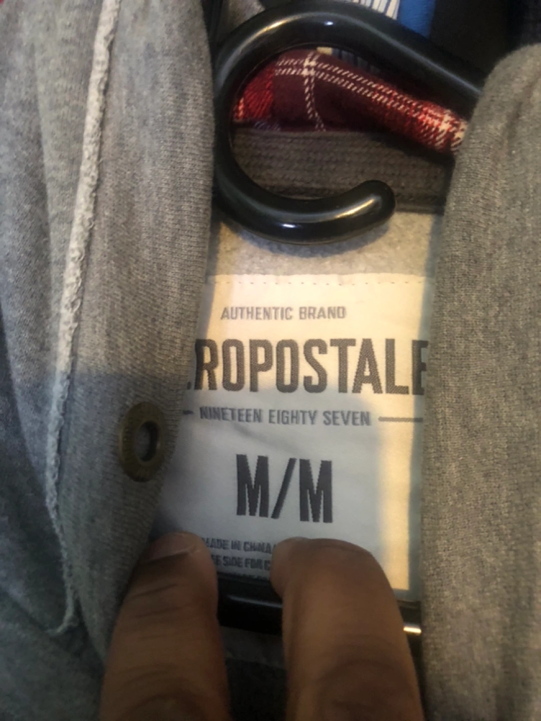Grey Aeropostale hoodie with 'New York' and 'Hudson Trail Hiking Club' graphics. It's a size M/M. Made in China.