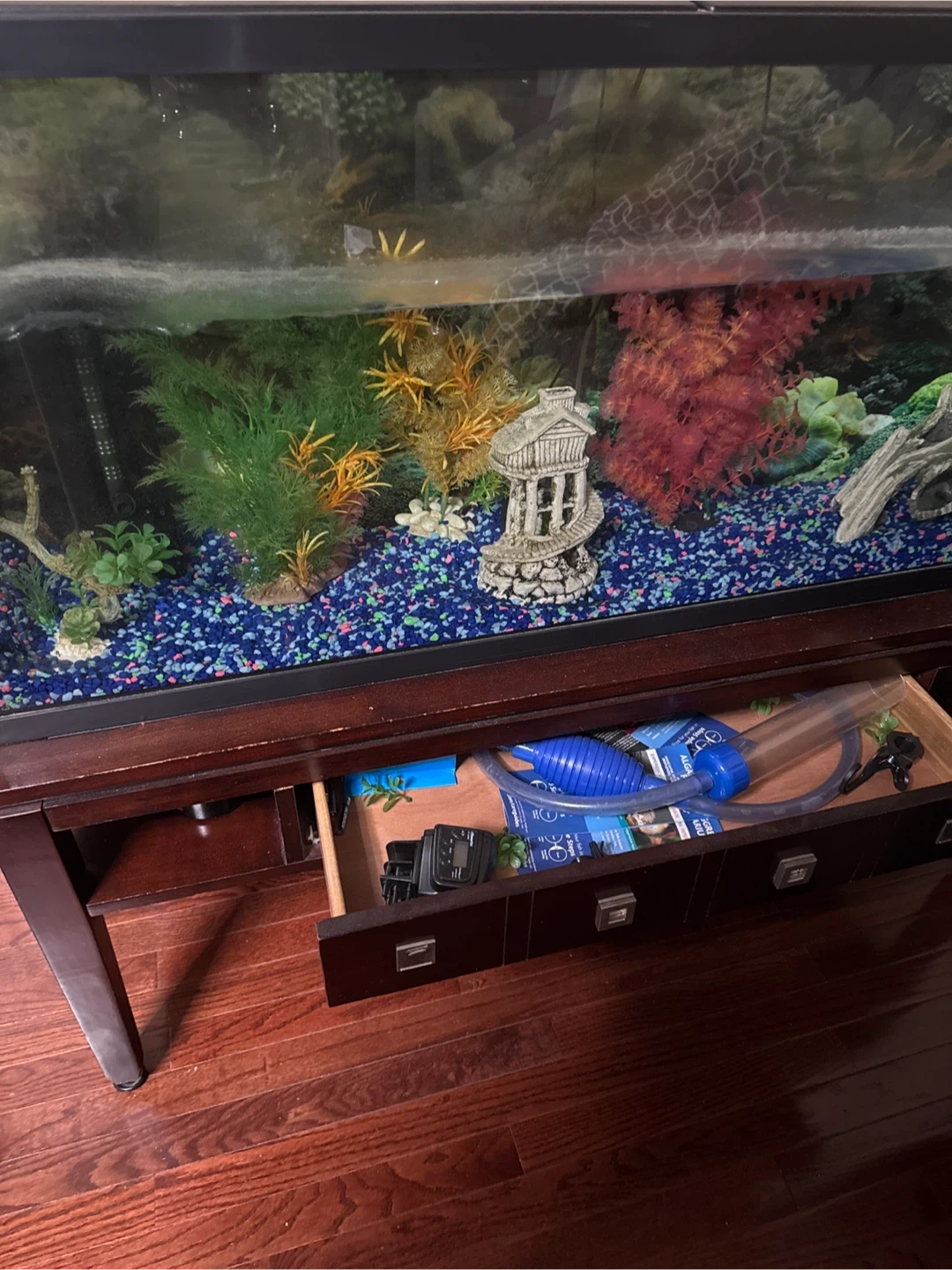 Selling a fish tank that comes with a stand and some accessories. It's all set up and ready to go for your aquatic friends!