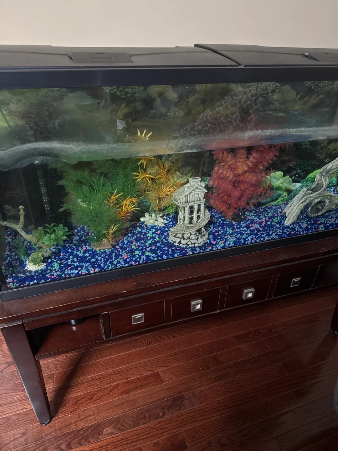 Selling a fish tank that comes with a stand and some accessories. It's all set up and ready to go for your aquatic friends!
